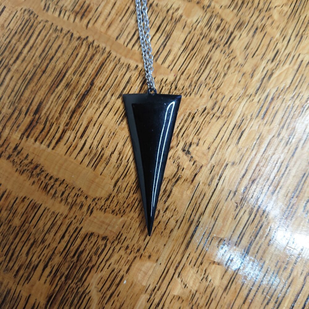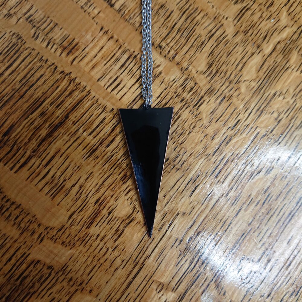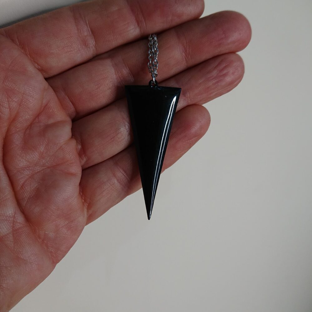 Black drop triangle shaped necklace on a silver colour, allergy safe surgical steel chain. The necklace comes in a black presentation box.  I enamelled the necklace in black vitreous enamel. This gives it a glossy shine.  The pendant is about 5cm tall. The chain is about 60cm total length. I call the shape a drop triangle. It’s a triangle, but stretched out and with the horizontal flat across the top.