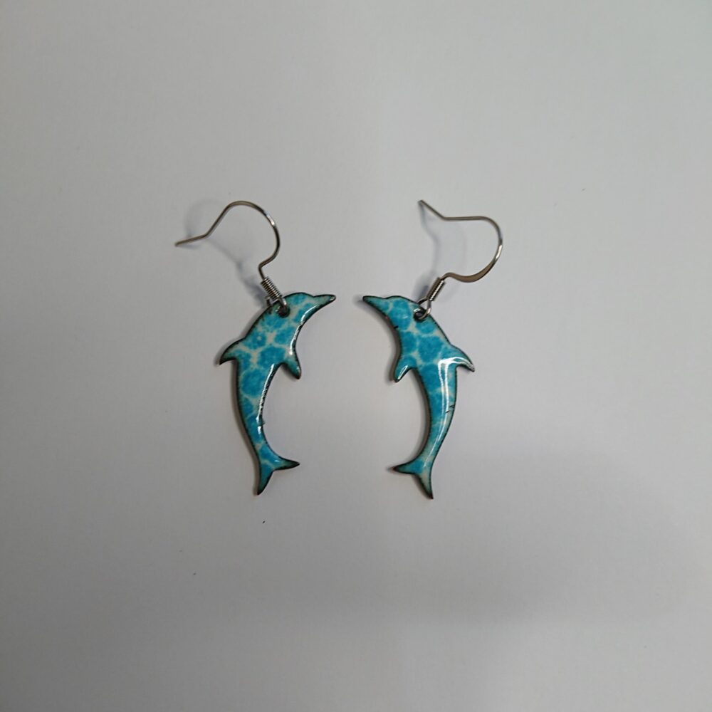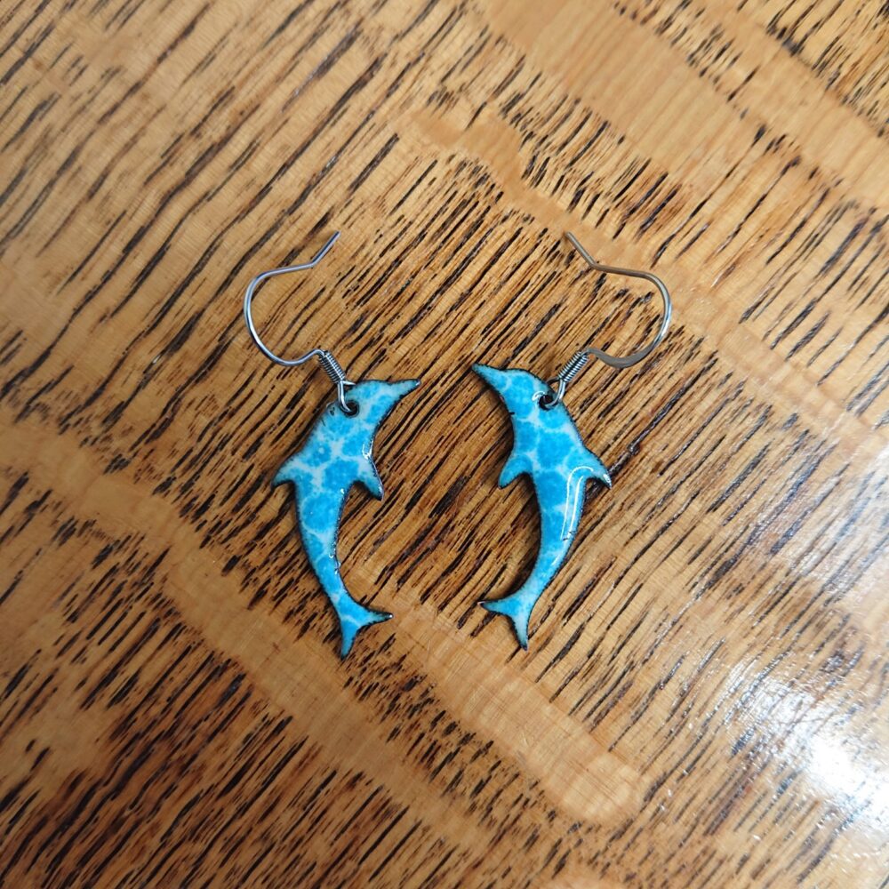 Blue and white, dolphin shaped earrings on surgical steel, allergy-safe earhooks, presented in a black box. I made these earrings using creamy white enamel (called ivory). On the last firing, I used teal colour enamel over a mesh to give teal or blue spot pattern. The back of the earrings have been enamelled in the creamy white because the enamel on the back stops them warping too much in the kiln. The backs are not as smooth because of how the earrings are supported in the kiln. The dolphins are 3cm long.