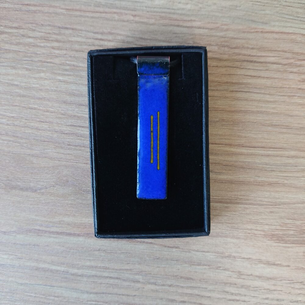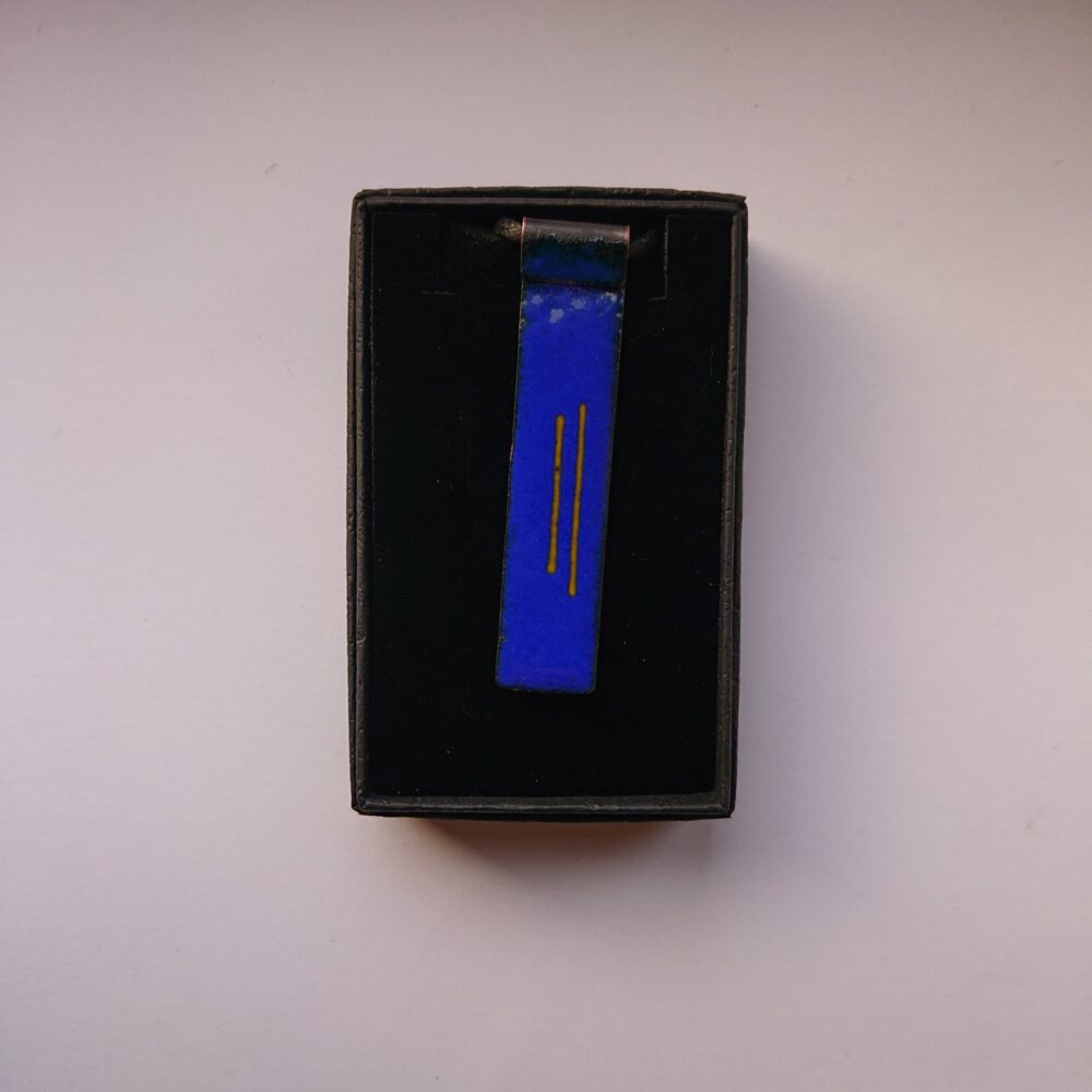 Blue rectangle enamelled copper necklace with two thin yellow stripes. To make this necklace, I cut a strip of copper and curled around one end. My aim was to have a different way to attach the cord to the pendant. I enamelled the rectangle in dark blue enamel (close to royal blue, perhaps a tiny bit darker). On the last firing I added two yellow glass strands. The back of the necklace has been enamelled in blue because the enamel on the back stops it warping too much in the kiln. The pendant is about 6cm by 1.4cm. It has a black waxed cotton cord with handmade copper t-bar type fixing. The cord is quite long because it can always be made shorter with a knot or scissors. The long bit of the fixing slides through the round bit. The fixing is pure copper without lacquer so will go darker with time.