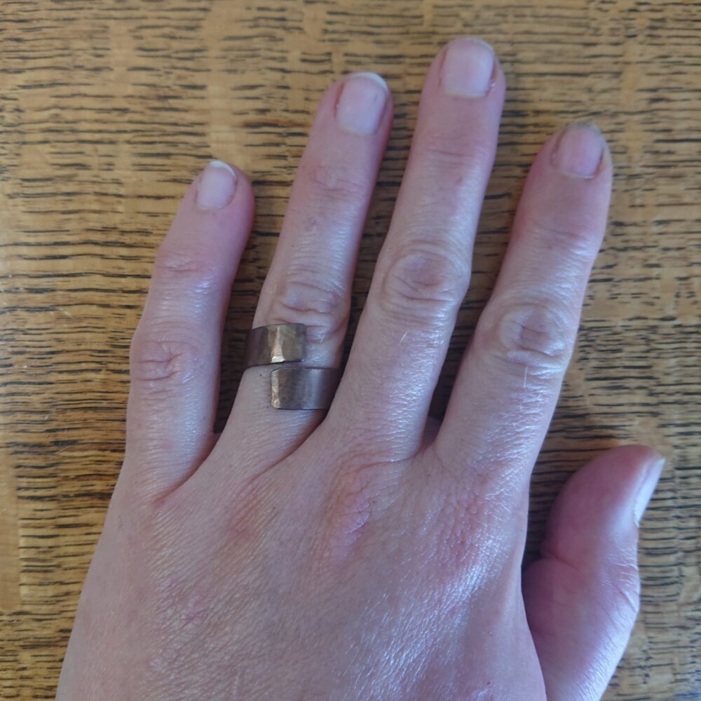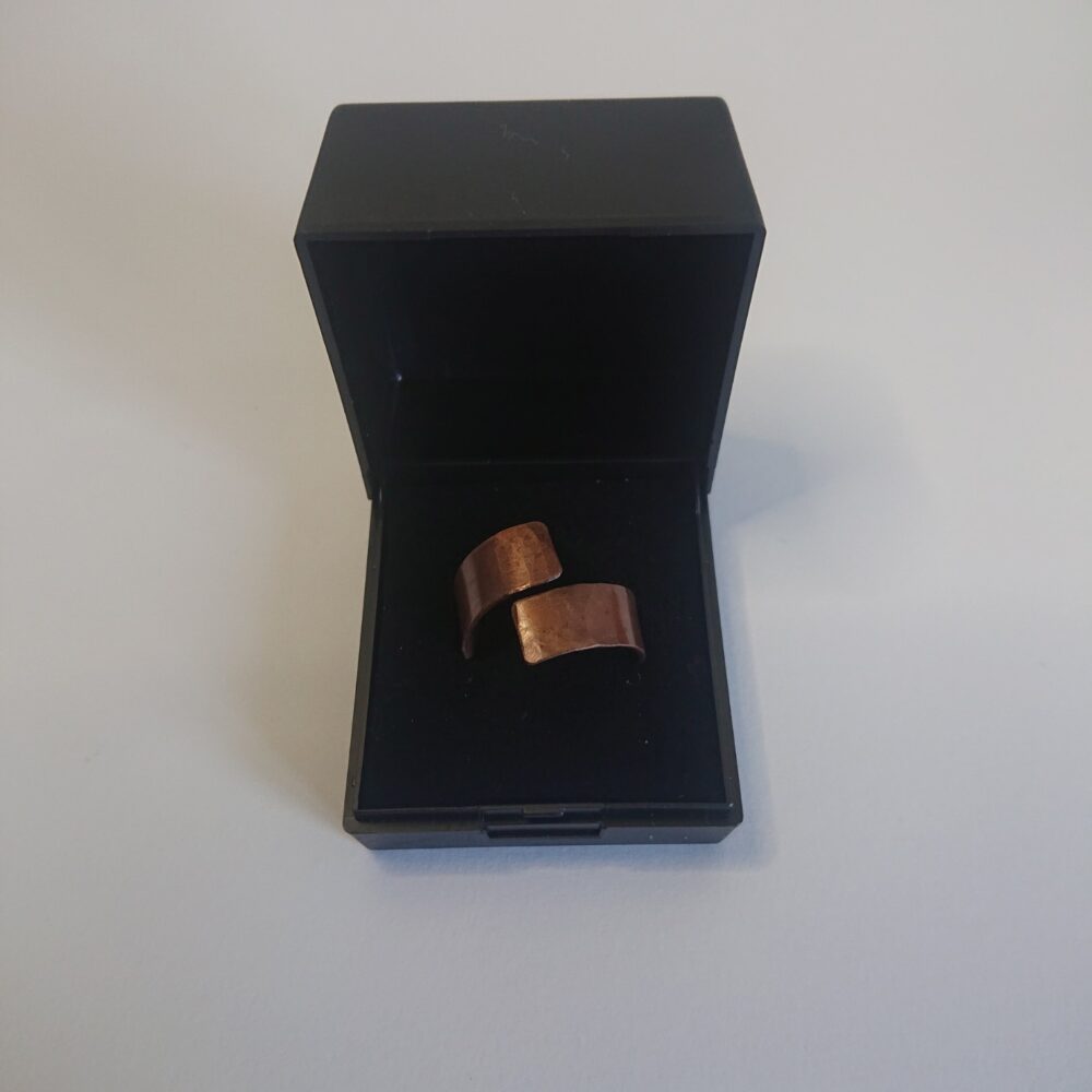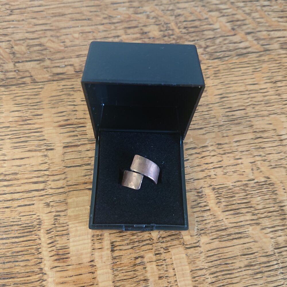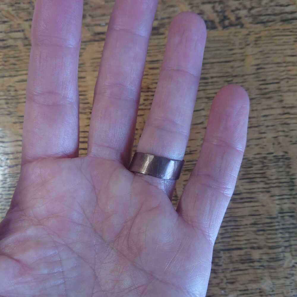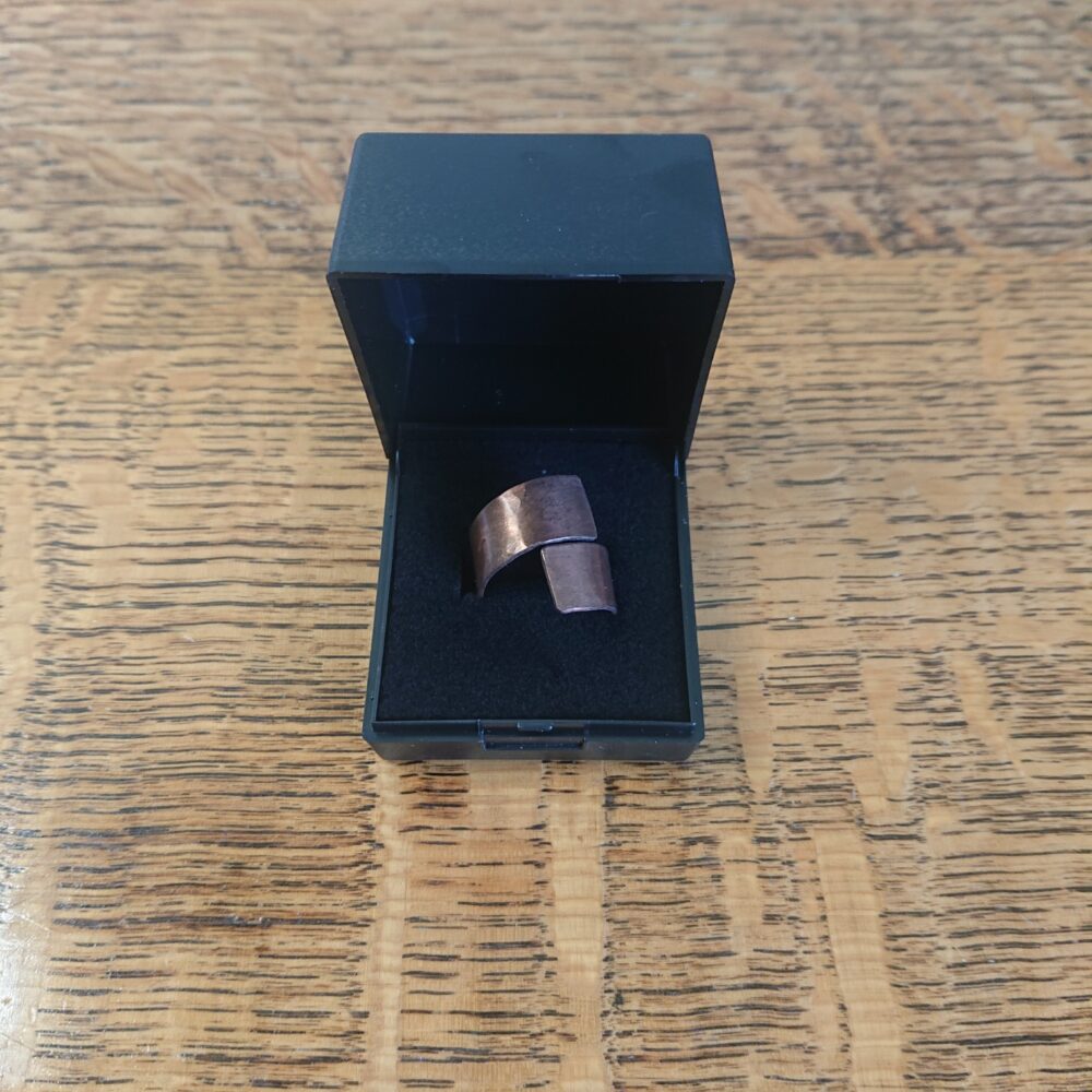 Chunky aged copper ring handmade from copper sheet with a hammered finish. I lightly hammered the ring, partly to make the copper a bit less bendy and partly to give a more interesting finish. To give an aged copper colour or patina, I used liver of sulphur. This gives a stable aged copper brown shade, though the shade varies every time I do it. The latest rings vary from milk chocolate to closer to dark chocolate shade brown. The chunky copper ring is made from strips of about 5 to 8mm wide copper sheet, but this varies a little. It comes in a black presentation box.