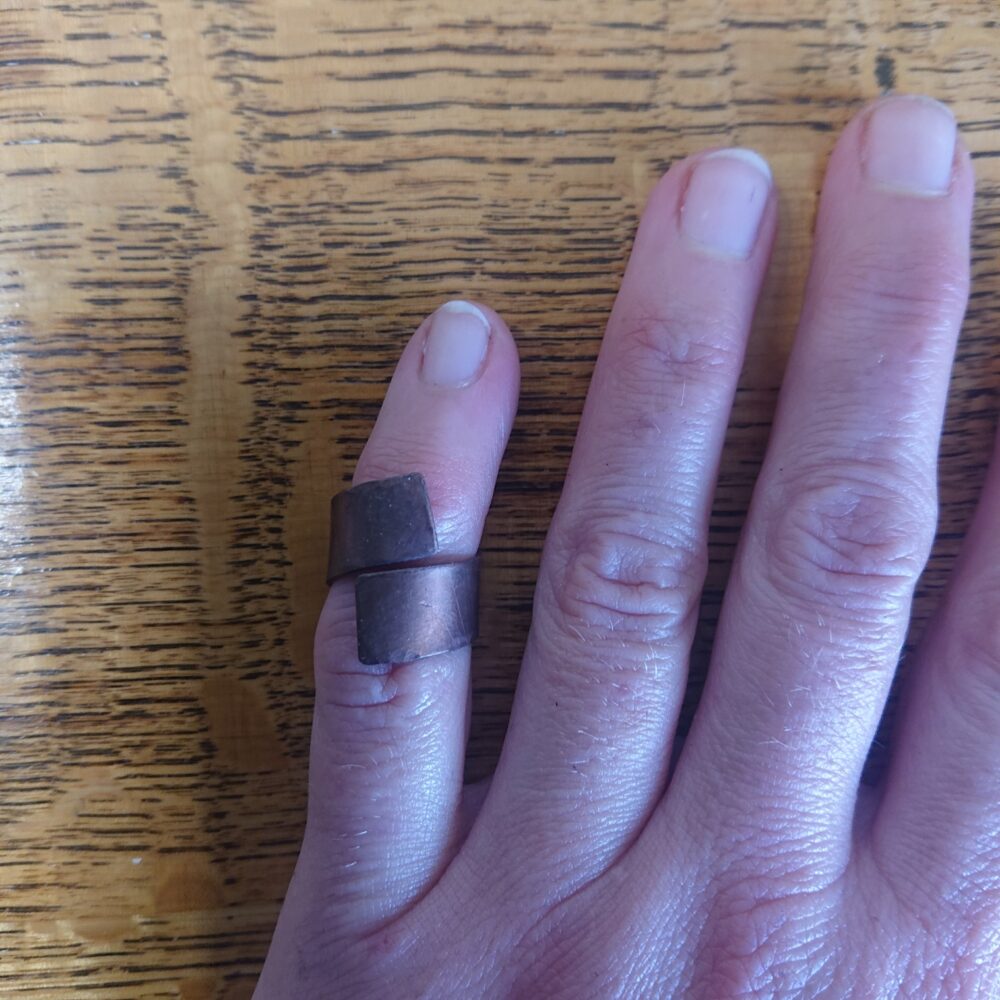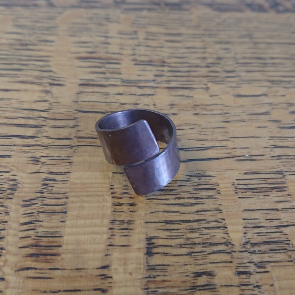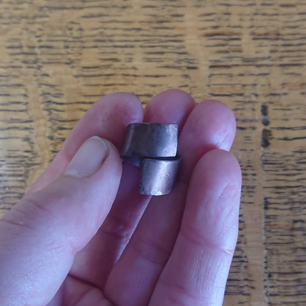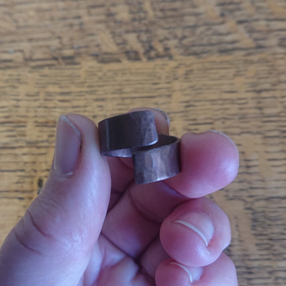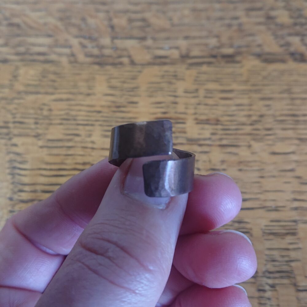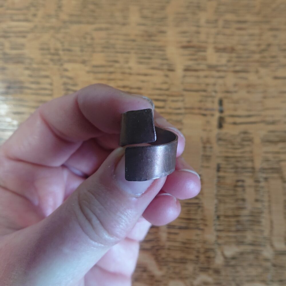 Chunky aged copper ring handmade from copper sheet with a hammered finish. I lightly hammered the ring, partly to make the copper a bit less bendy and partly to give a more interesting finish. To give an aged copper colour or patina, I used liver of sulphur. This gives a stable aged copper brown shade, though the shade varies every time I do it. The latest rings vary from milk chocolate to closer to dark chocolate shade brown. The chunky copper ring is made from strips of about 5 to 8mm wide copper sheet, but this varies a little. It comes in a black presentation box.