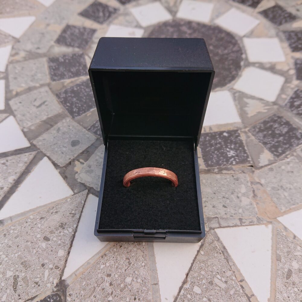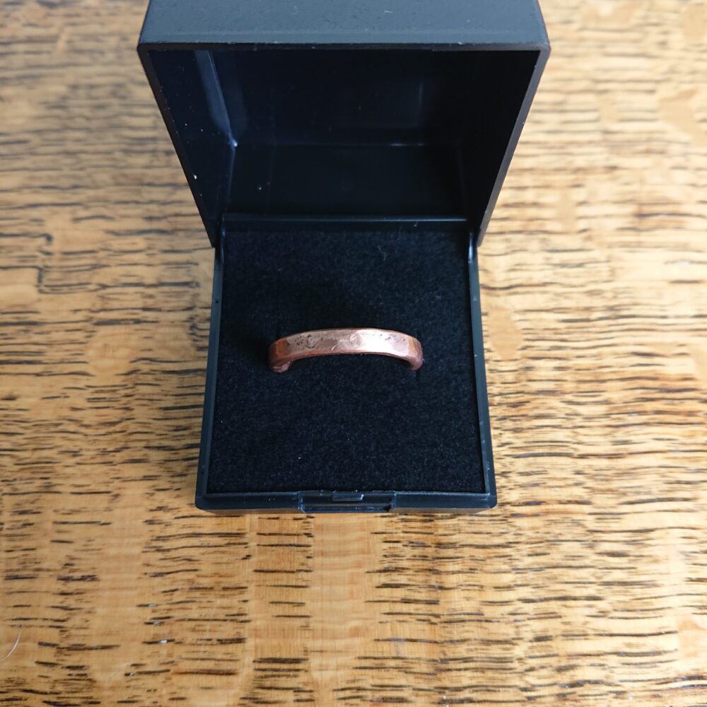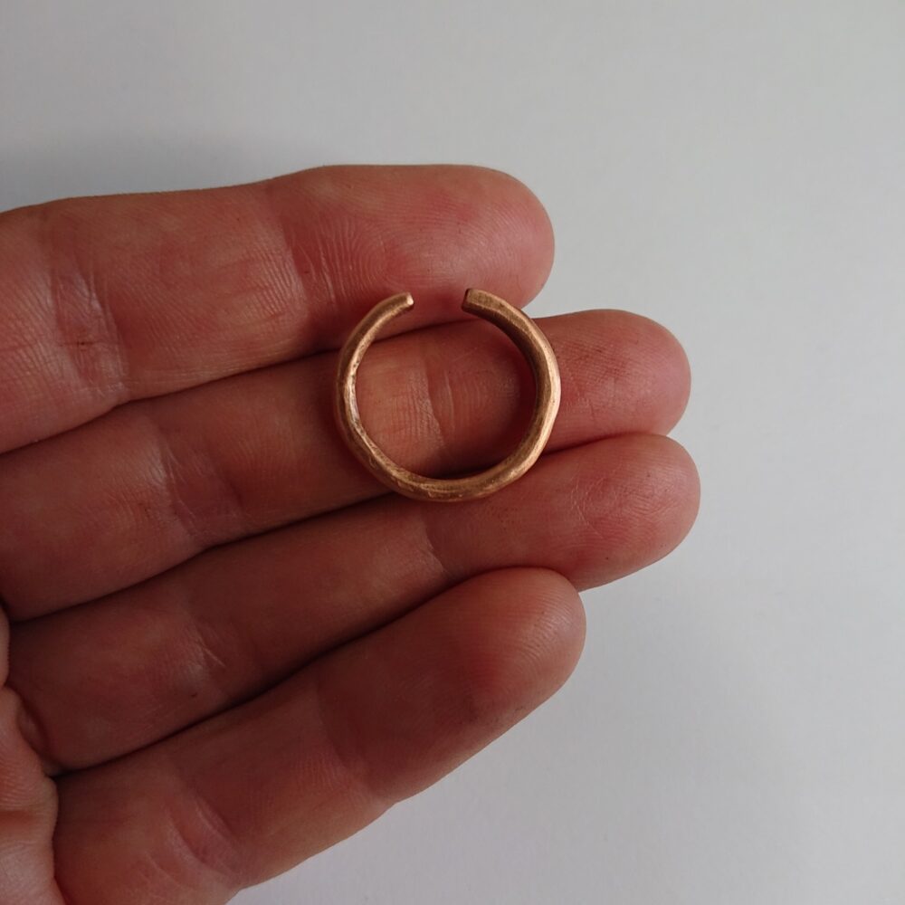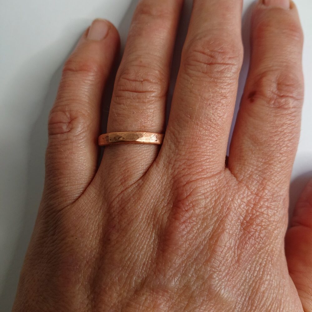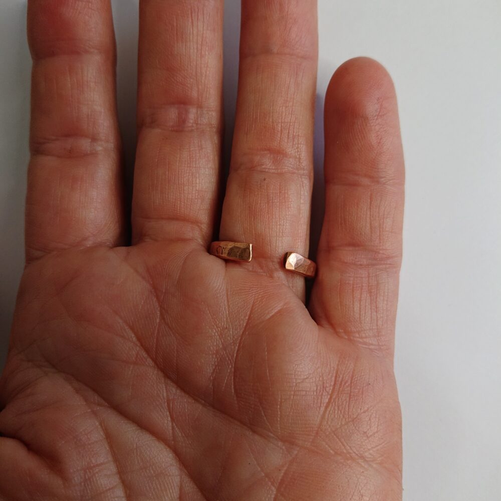 Chunky copper wire cuff ring, handmade with a hammered finish. I made this ring by cutting a length of chunky copper wire. I hammered it to flatten it so that it’s closer to rectangular rather than round cross-section. I bent it round to form a ring, with a narrow gap. The ring has been lacquered to try to keep the bright copper colour, but it may rub off with use. It comes in a black presentation box. The band is about 3mm high and 2mm deep.