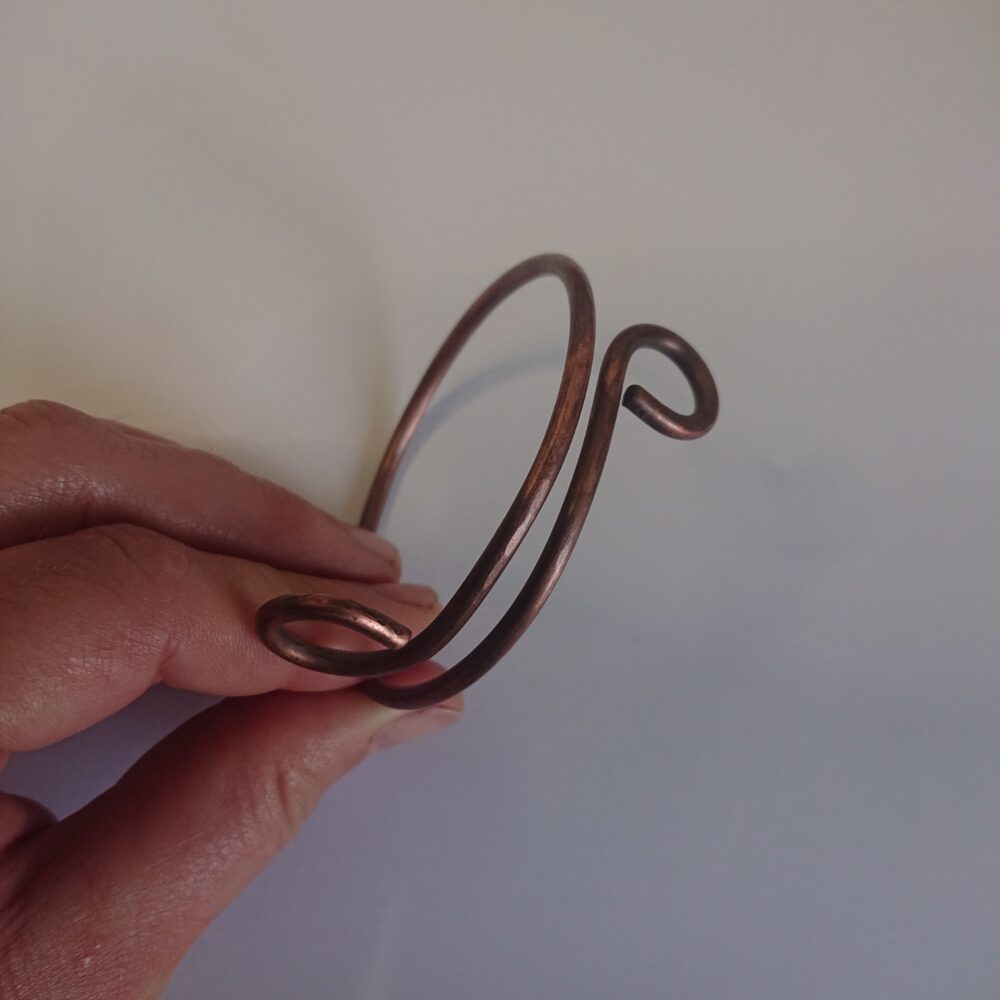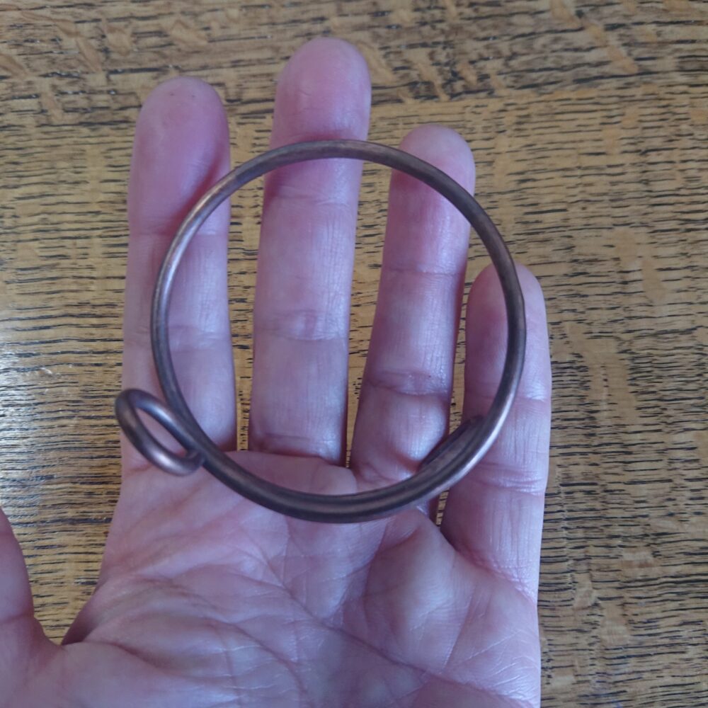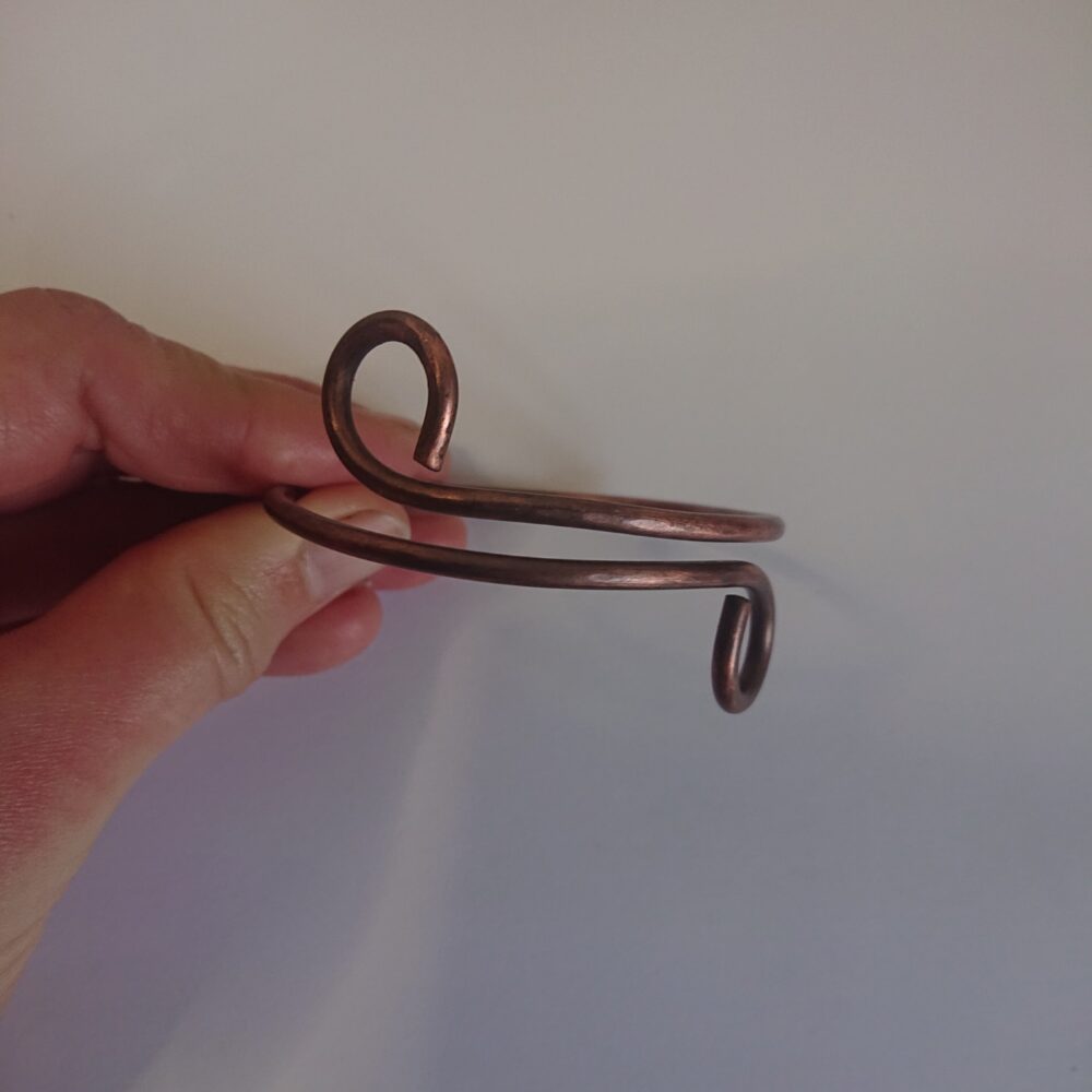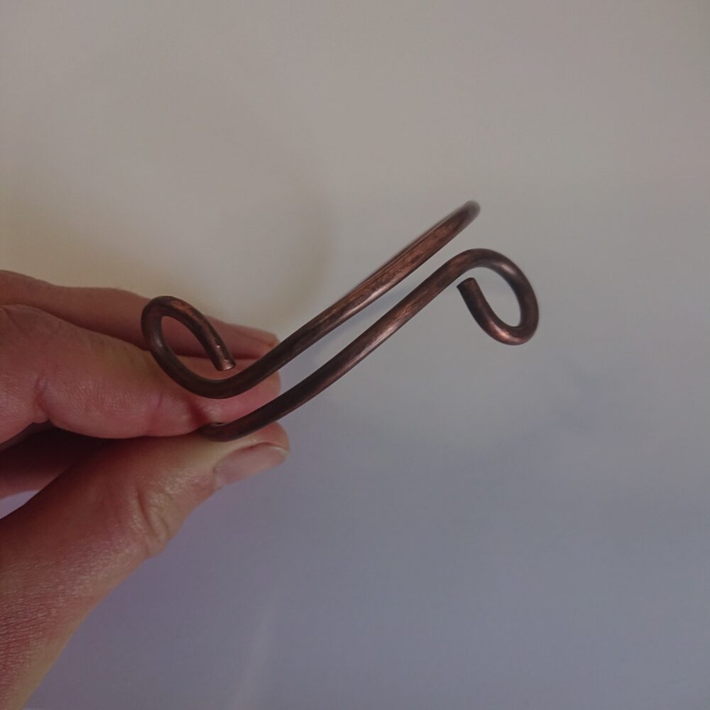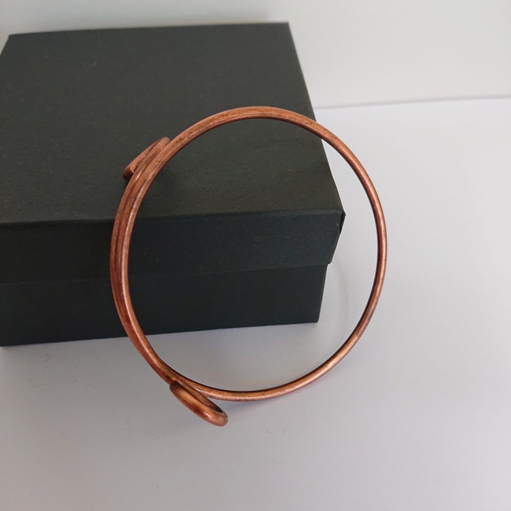 Bangle made from copper wire with aged copper colour patina. I made this bangle or bracelet starting by cutting a length of pure copper wire. I curled the ends then hammered it around a mandrel to get it round. This gives a light hammered texture that I like and makes the copper a little less soft. To give it an aged copper colour or patina, I used liver of sulphur. This gives a stable colour, but the shade varies every time I do it. The bangle I currently have in stock is not a very dark aged copper colour. I’d call it somewhere between milk and dark chocolate.