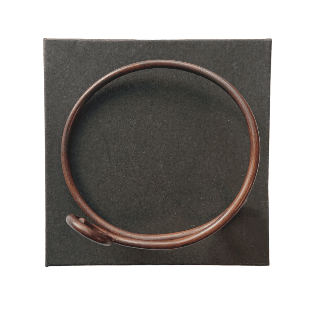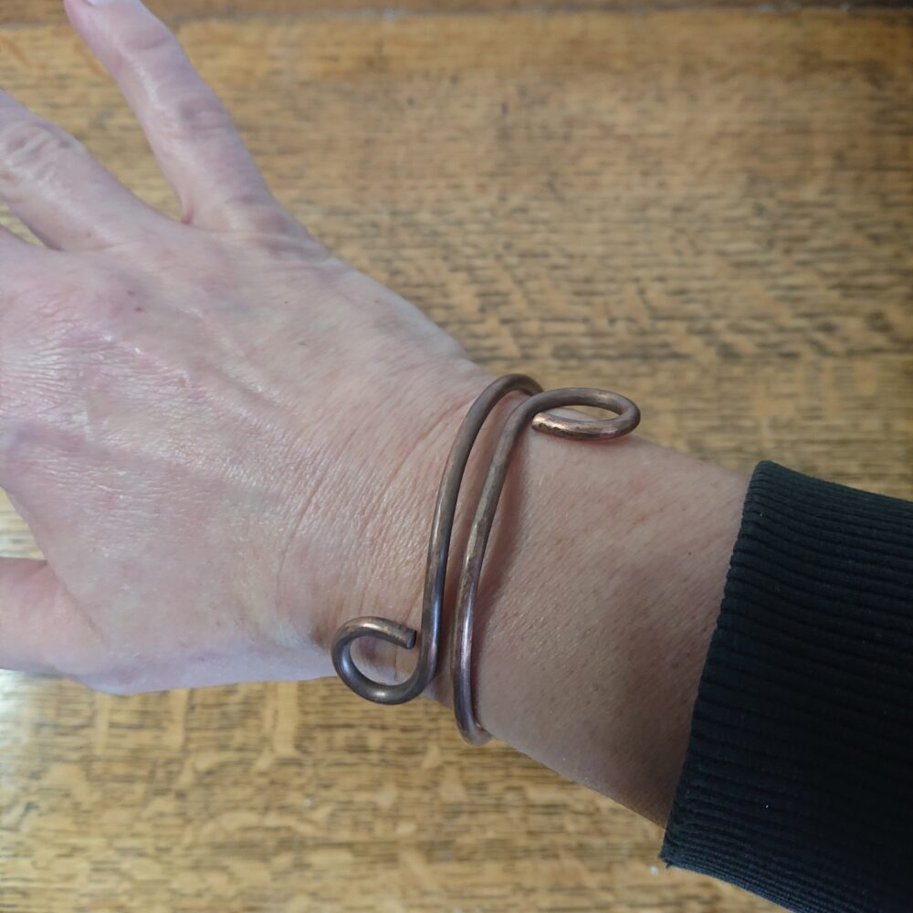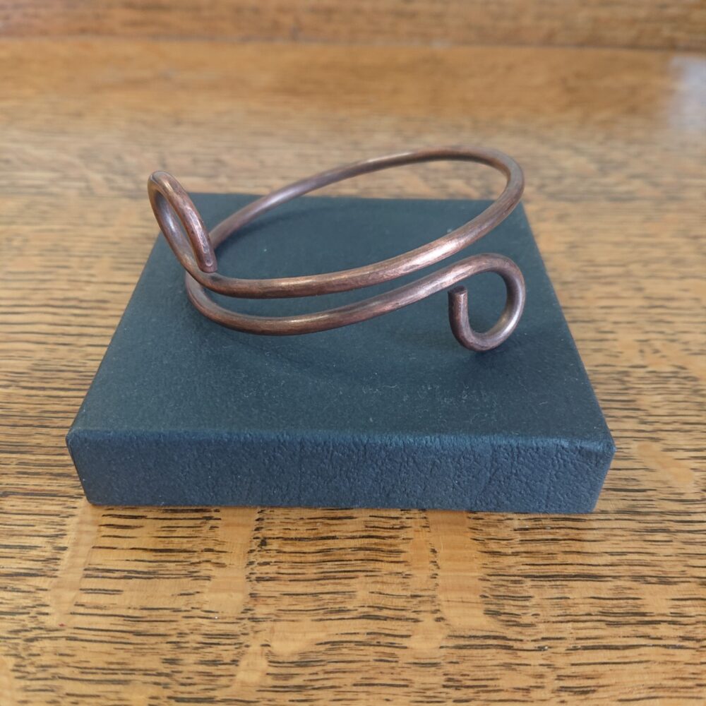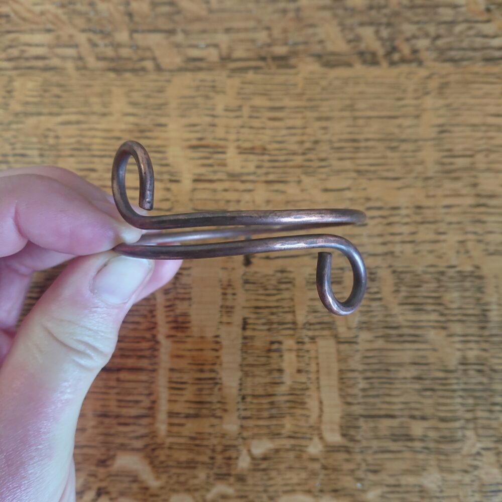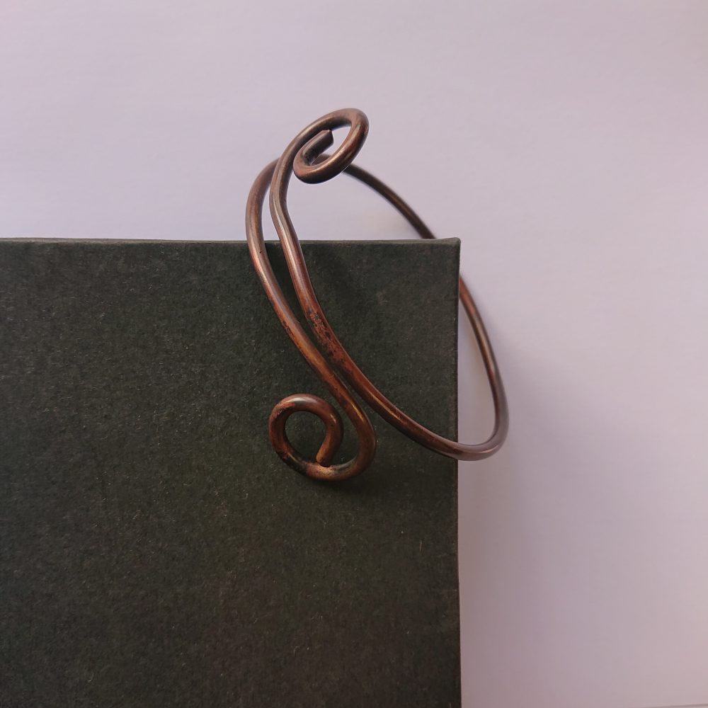 Bangle made from copper wire with aged copper colour patina. I made this bangle or bracelet starting by cutting a length of pure copper wire. I curled the ends then hammered it around a mandrel to get it round. This gives a light hammered texture that I like and makes the copper a little less soft. To give it an aged copper colour or patina, I used liver of sulphur. This gives a stable colour, but the shade varies every time I do it. The bangle I currently have in stock is not a very dark aged copper colour. I’d call it somewhere between milk and dark chocolate.