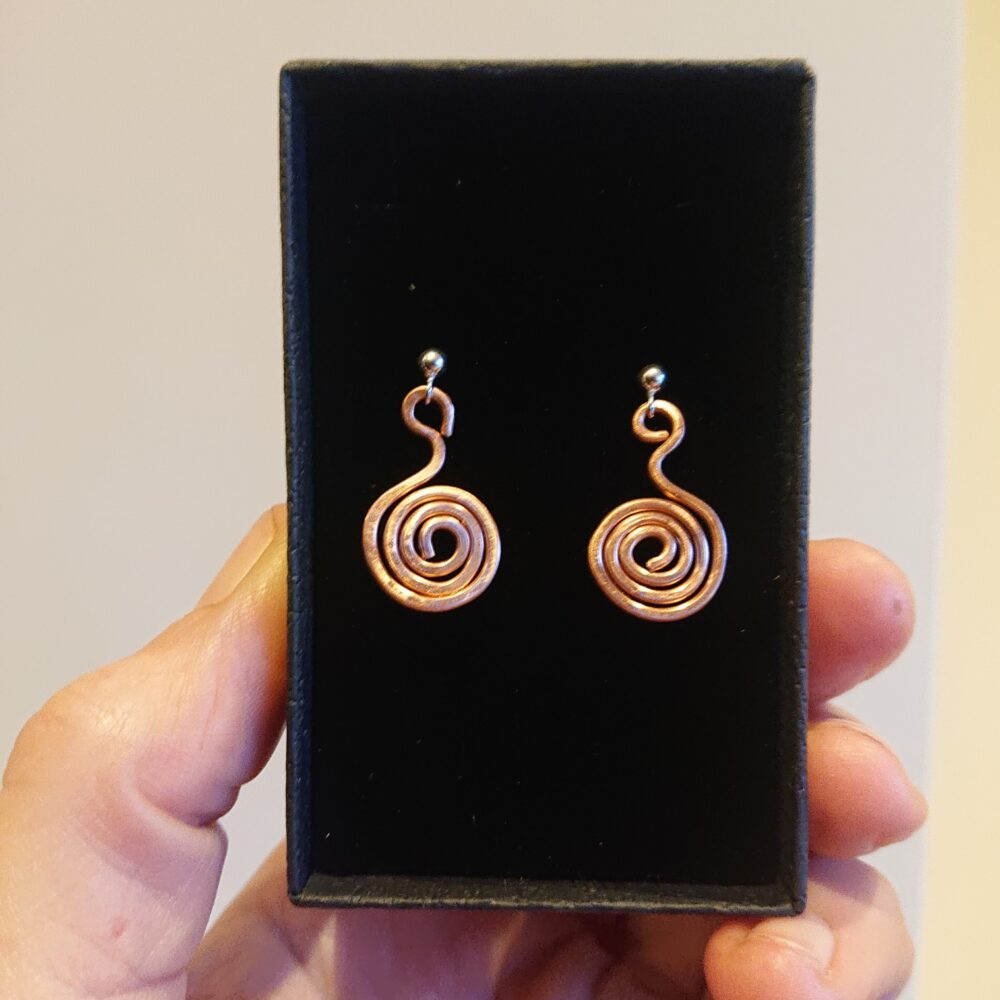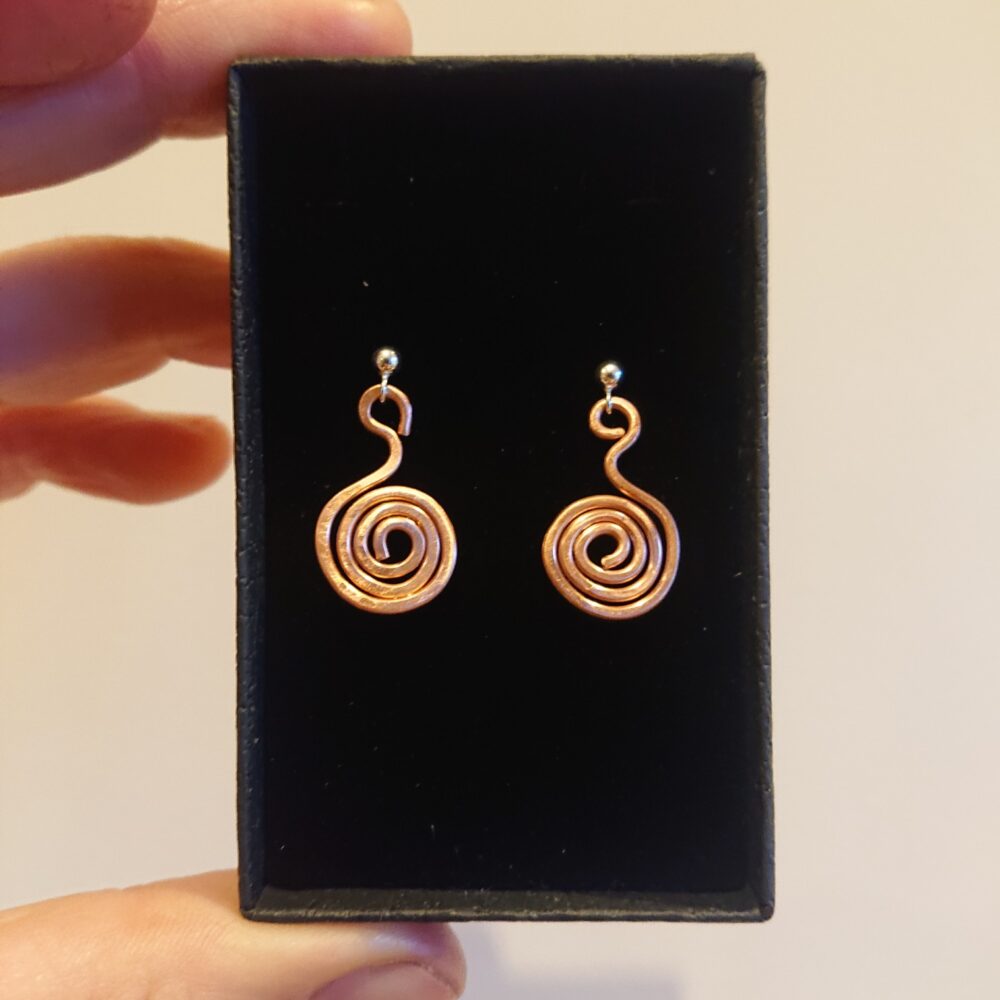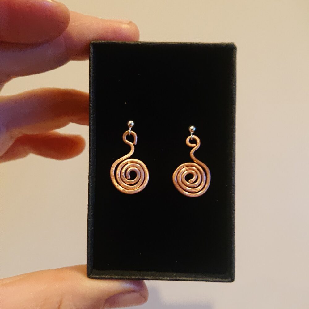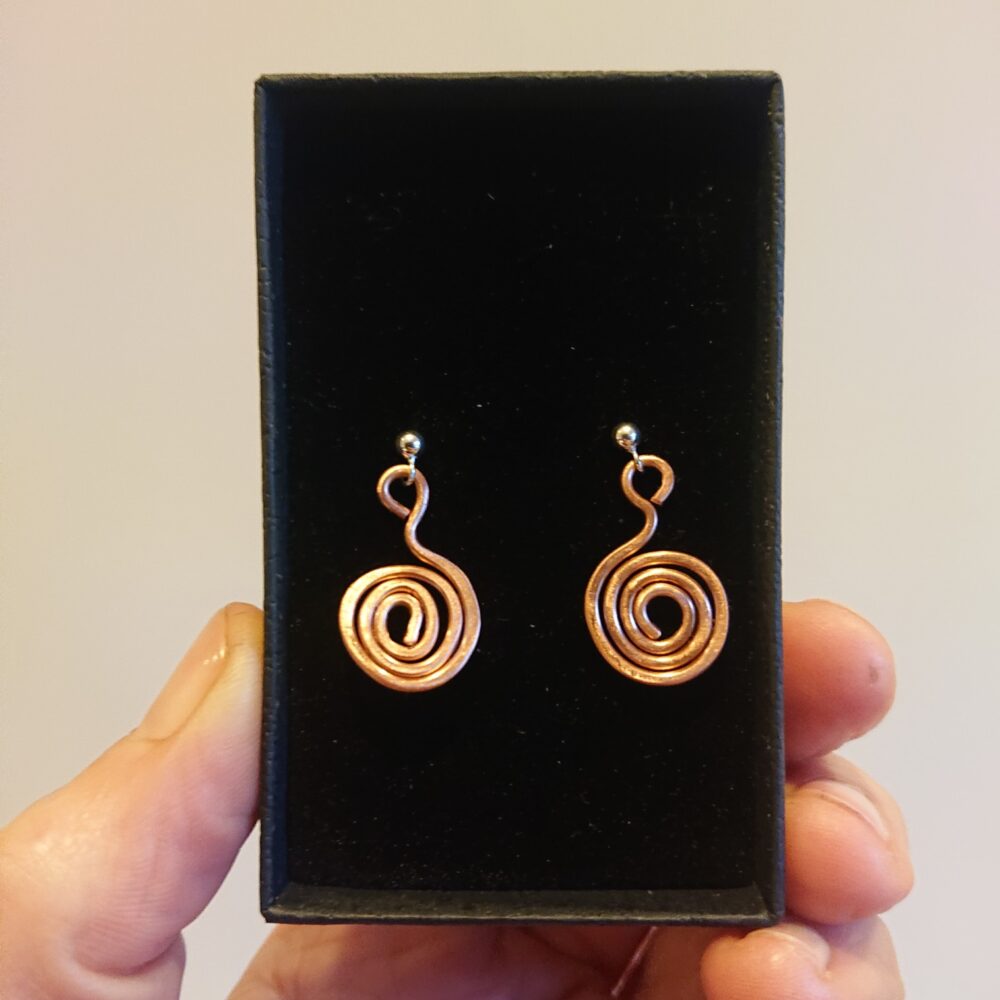 I made these earrings by cutting a length of copper wire, which I shaped partly with pliers, partly by hand. I polished them to nice, shiny, bright copper. The copper colour is protected with lacquer, but it may rub off with time. I attached the swirls to sterling silver studs. The earrings come in a black presentation box.