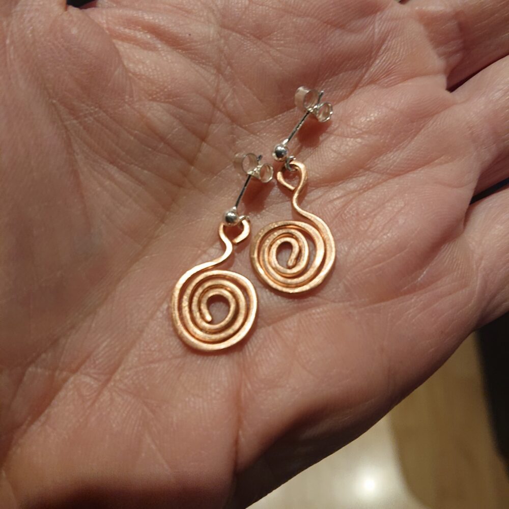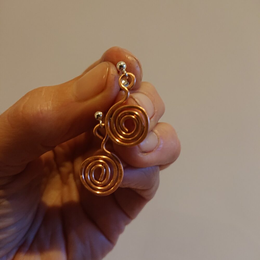 Copper wire earrings in a swirl or curly shape. The earrings have sterling silver ear studs.