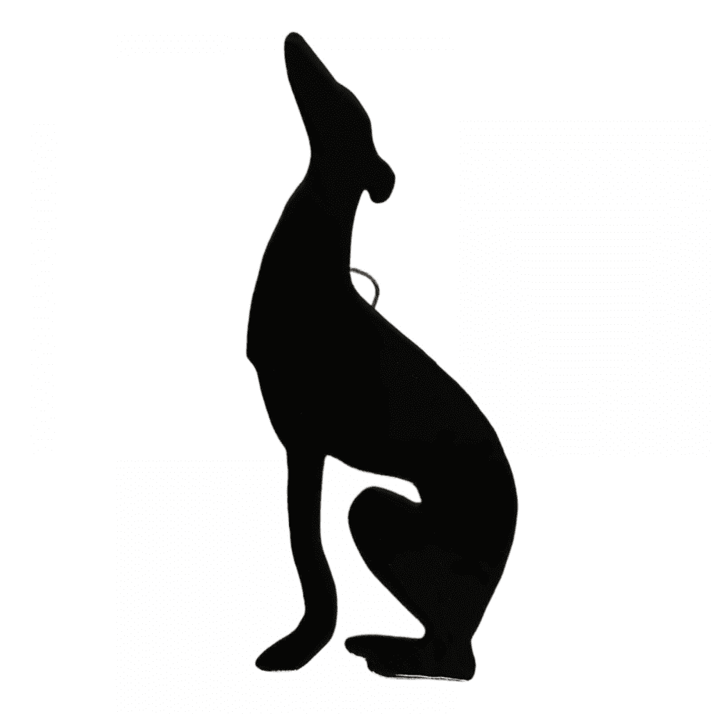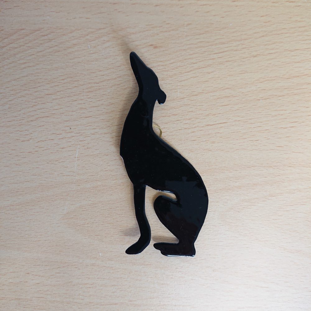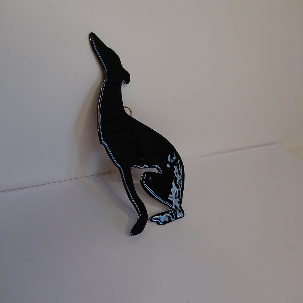 Enamelled black sitting greyhound or greyhound silhouette. Could also be an Italian Greyhound or Whippet. I cut the dog out of sheet copper before enamelling it with vitreous enamel. There is a hook on the back so it can be hung. The hook is picture wire, held in place with double sided tape that can be used instead to attach the dog to a frame or wall. It is approx 6cm wide and 13cm tall.