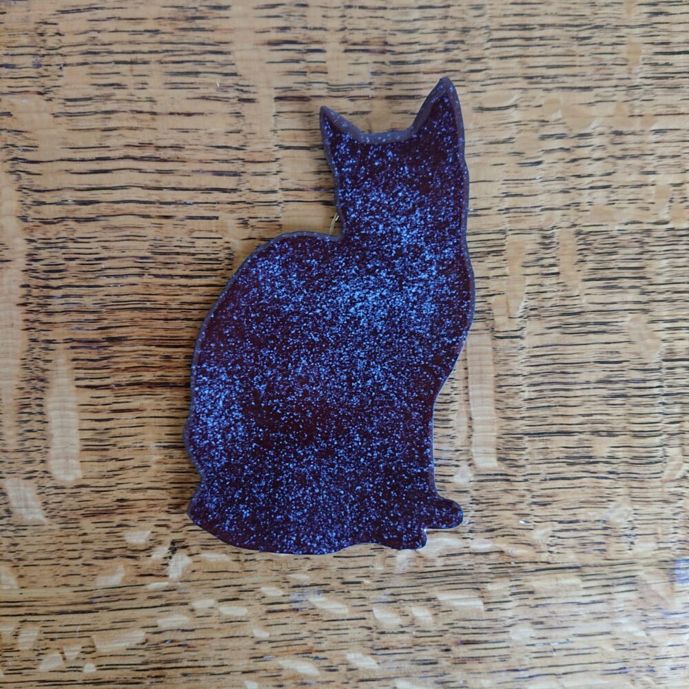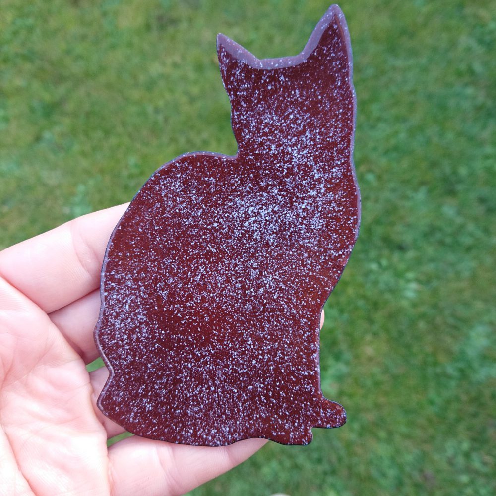 Enamelled sitting cat wall hanging or wall art. The cat is milk chocolate brown, perhaps a touch darker, and it has lots of pale dots in it. The dots should be white, based on the enamel I used, but they look a tiny bit grey, even a little like a very pale blue in some lights.
