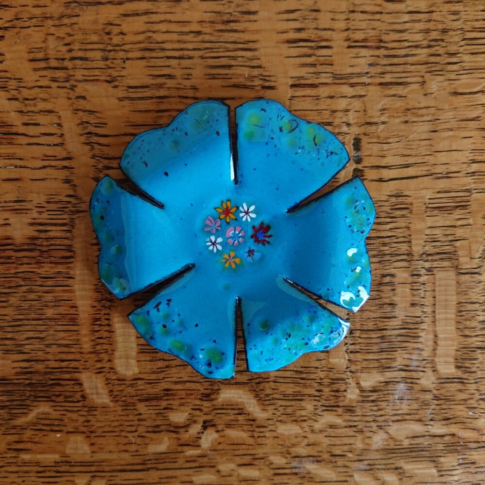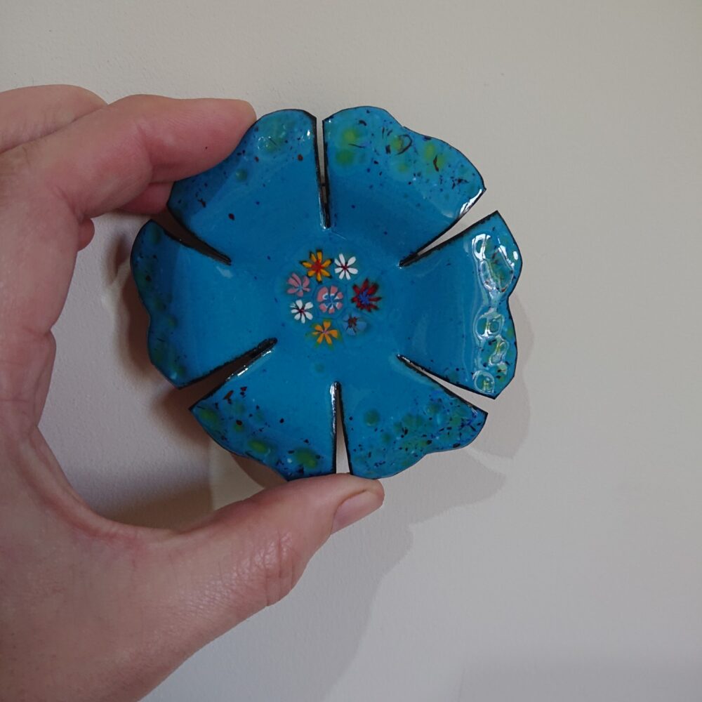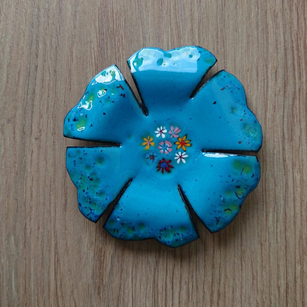 Enamelled flower design wall hanging. The main colour is teal (turquoise, turquoise blue), with coloured dots around the tips of the petals and mini flowers in the centre. I cut a flower shape from sheet copper, curved the tips then enamelled it with vitreous enamel. There is a hook on the back so it can be hung. It is about 8.5cm diameter.