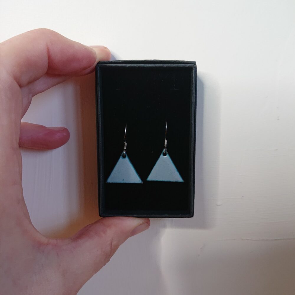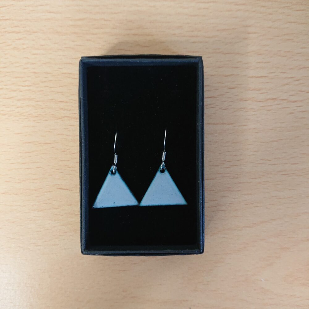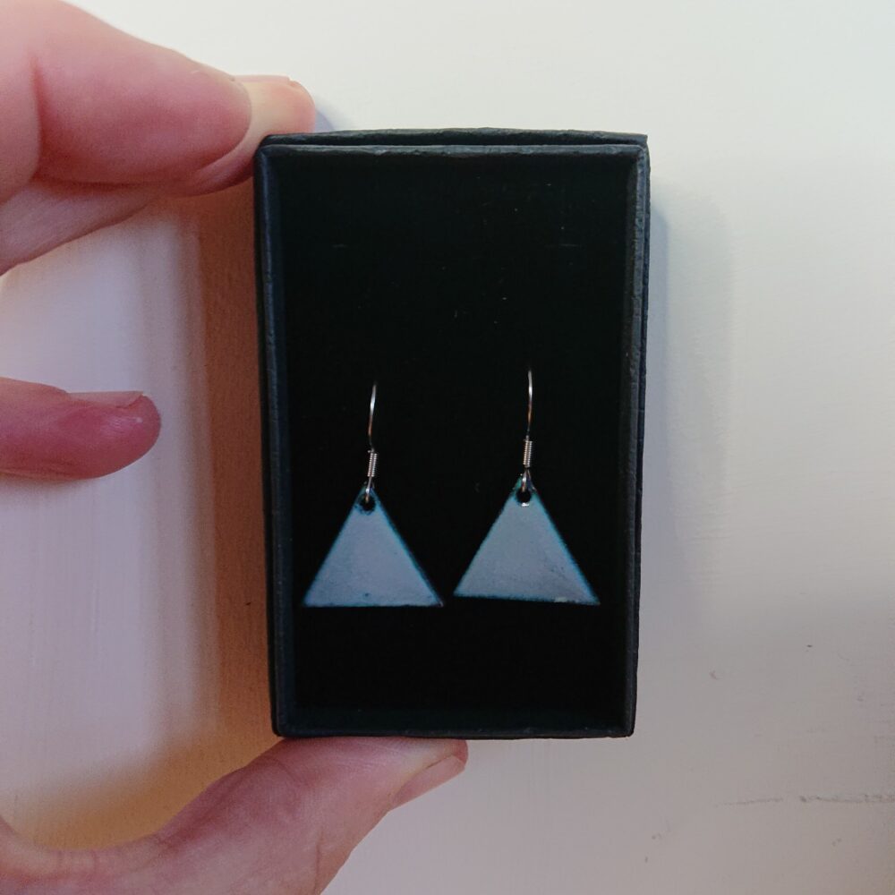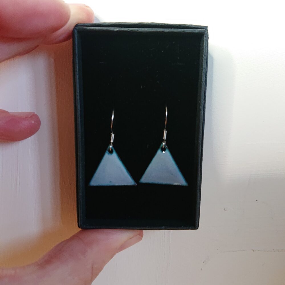 Grey triangular earrings on surgical steel, allergy-safe earhooks, presented in a black box. The back of the earrings have been enamelled in grey too because the enamel on the back stops them warping too much in the kiln. The grey is a mid to slightly darker shade. On the last firing I gave the earrings longer in the kiln. This has given tiny darker dots and some tiny green-ish dots. The triangles are just over 1cm long.