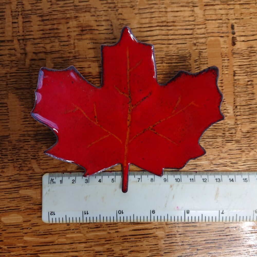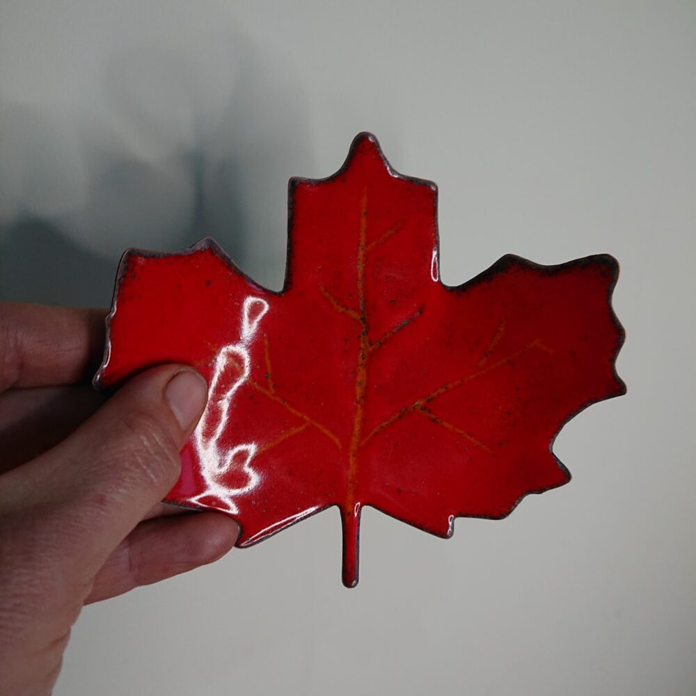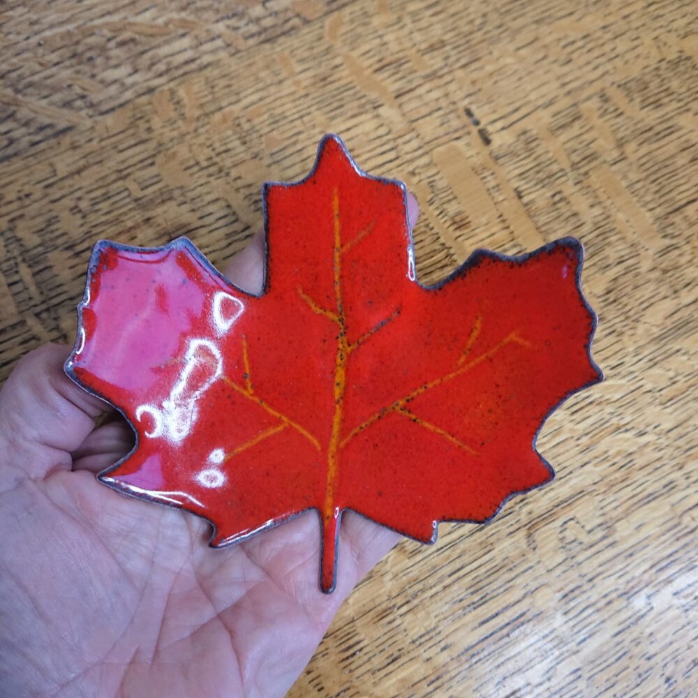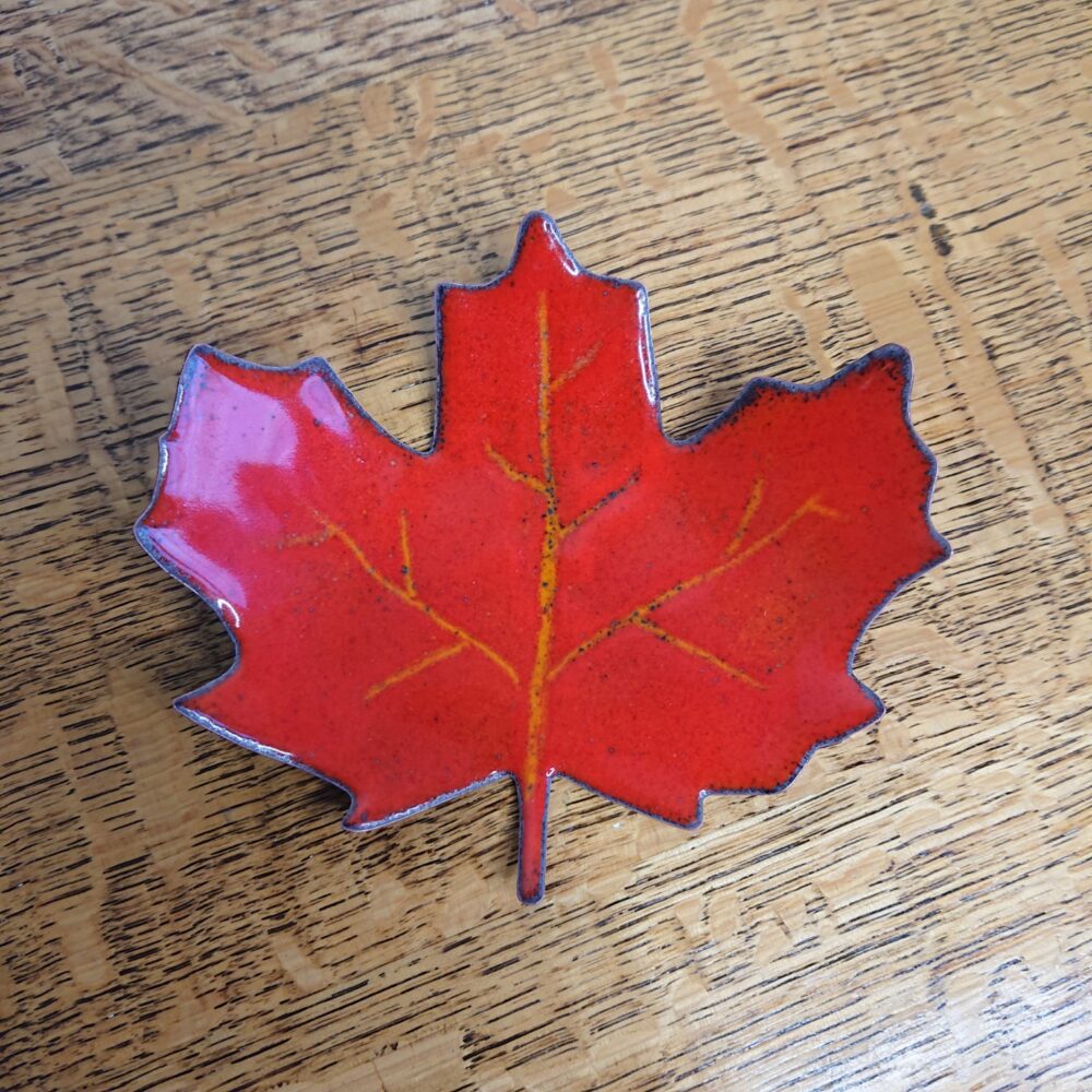 Handmade enamelled decorative leaf that can be used as a bowl or tealight holder. This leaf concept started from a real leaf I found when I was walking the dog. I made the leaf into a template, but with rounded tips so it’s safer. I used the template the cut the leaf from copper using a jewellers saw. Once I had a leaf, I used a hammer to bend up the edges of the leaf. With my kiln, I enamelled the leaf using orange enamel. On the last firing I used red enamel, but scraped away to the orange underlayer to give veins. I put the leaf in the kiln for a little longer to overfire the leaf – this gave more of an autumnal, interesting leaf, with a dark outer edge and some dark dots.