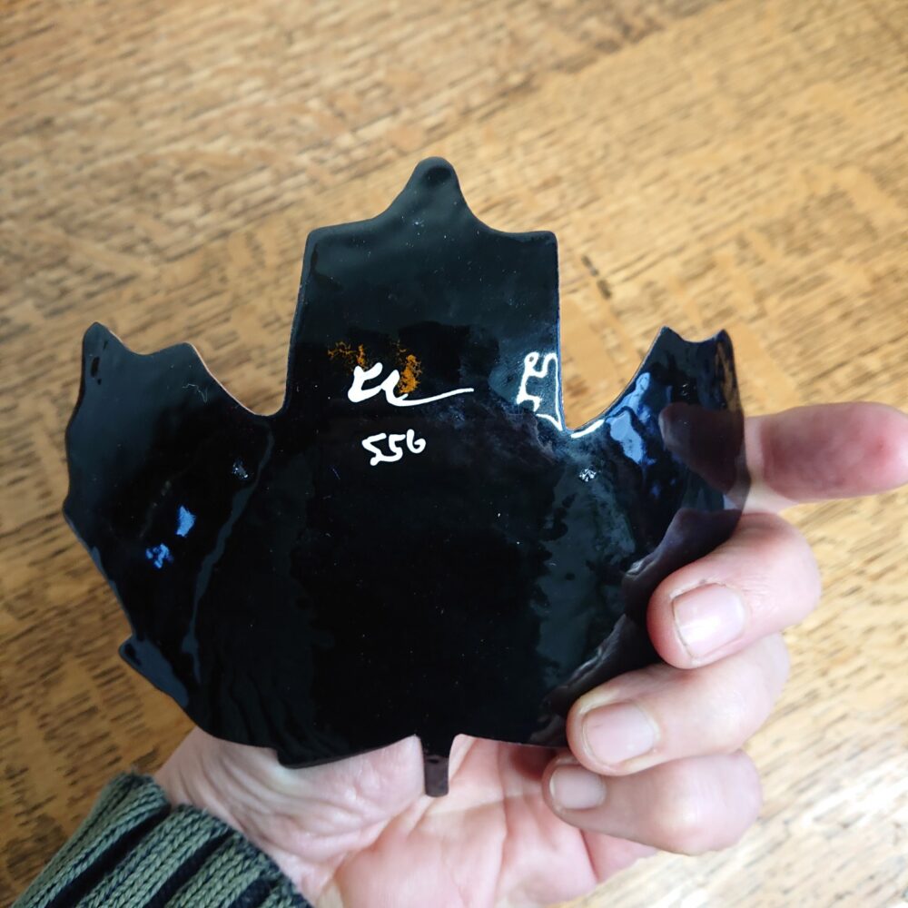 The back of the leaf is enamelled in black and shows marks from how it was held when it is in the kiln. Enamelling the back reduces how much the copper warps in the kiln. I’ve signed the back and included the bowl’s unique id number. One photo shows the back.