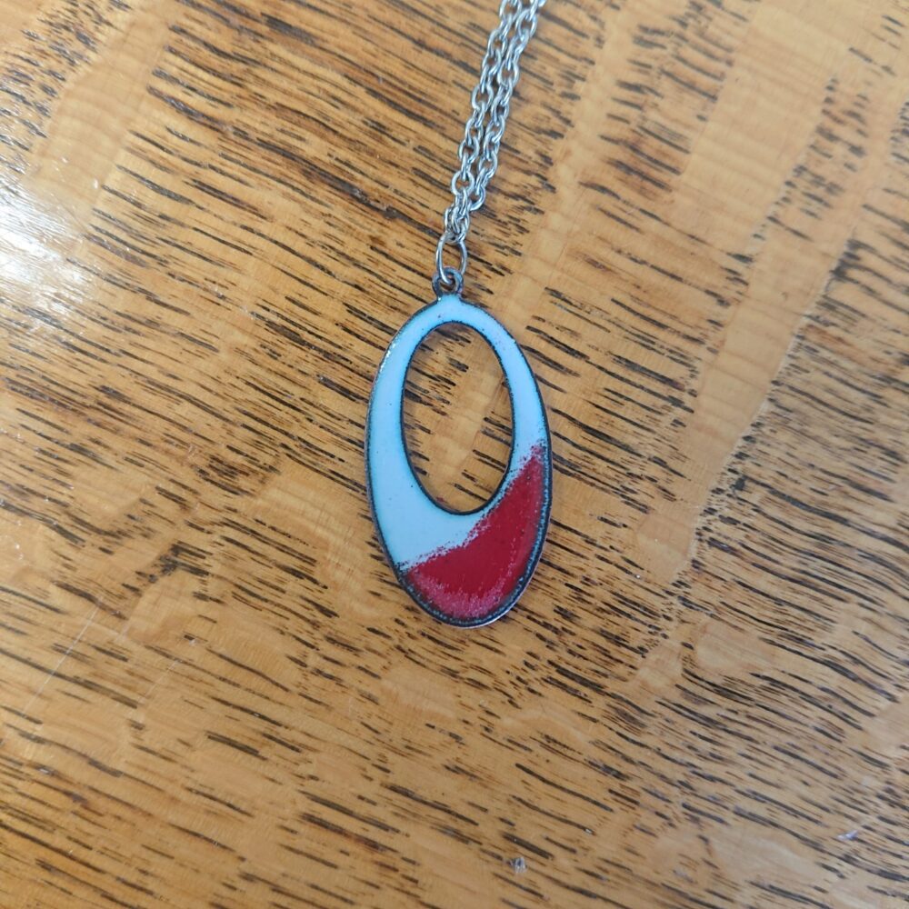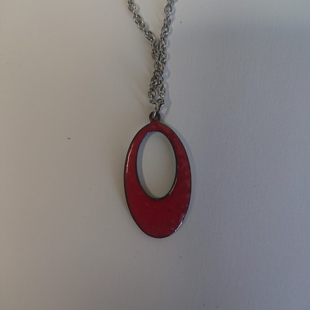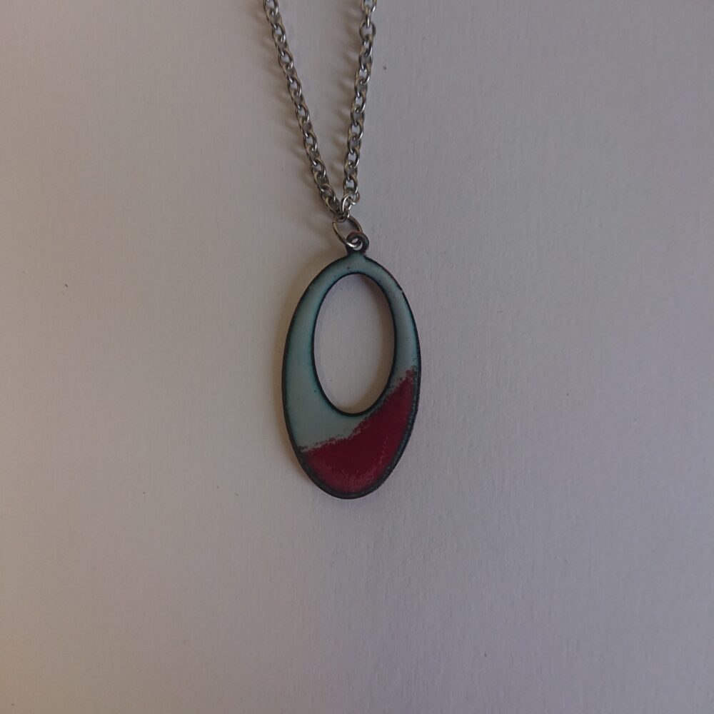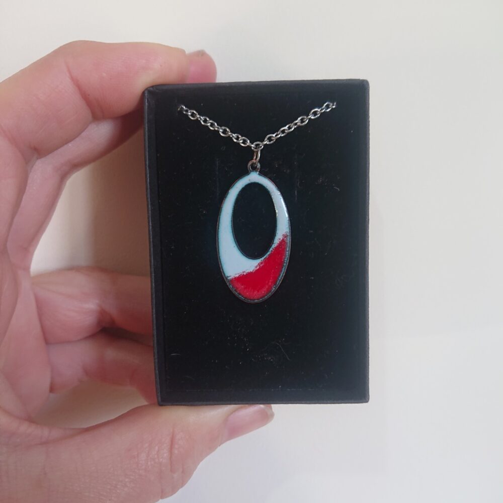Oval grey and red enamelled necklace on silver colour, surgical steel, allergy-safe chain, presented in a black box. The oval has an oval hole in it. I made the necklace using pale grey opaque vitreous enamel. I then added red to the bottom, intentionally wonky, to make it more interesting