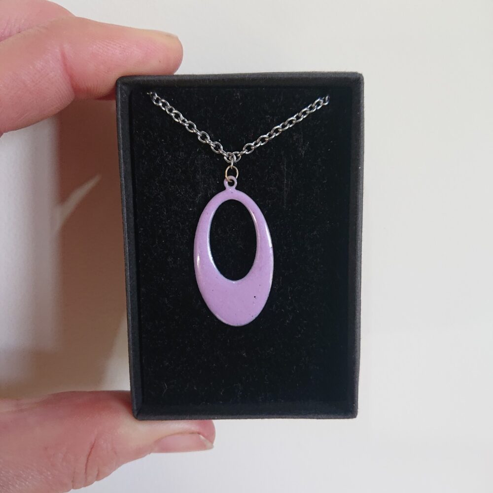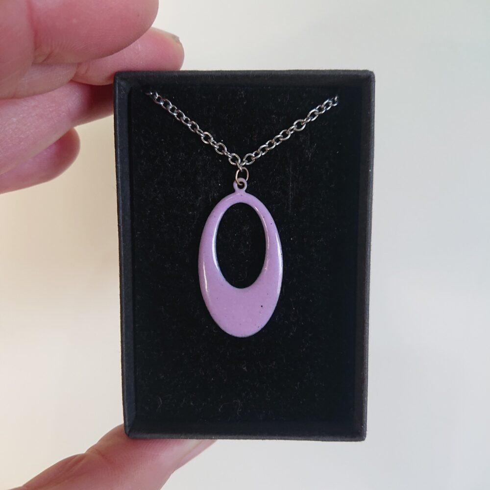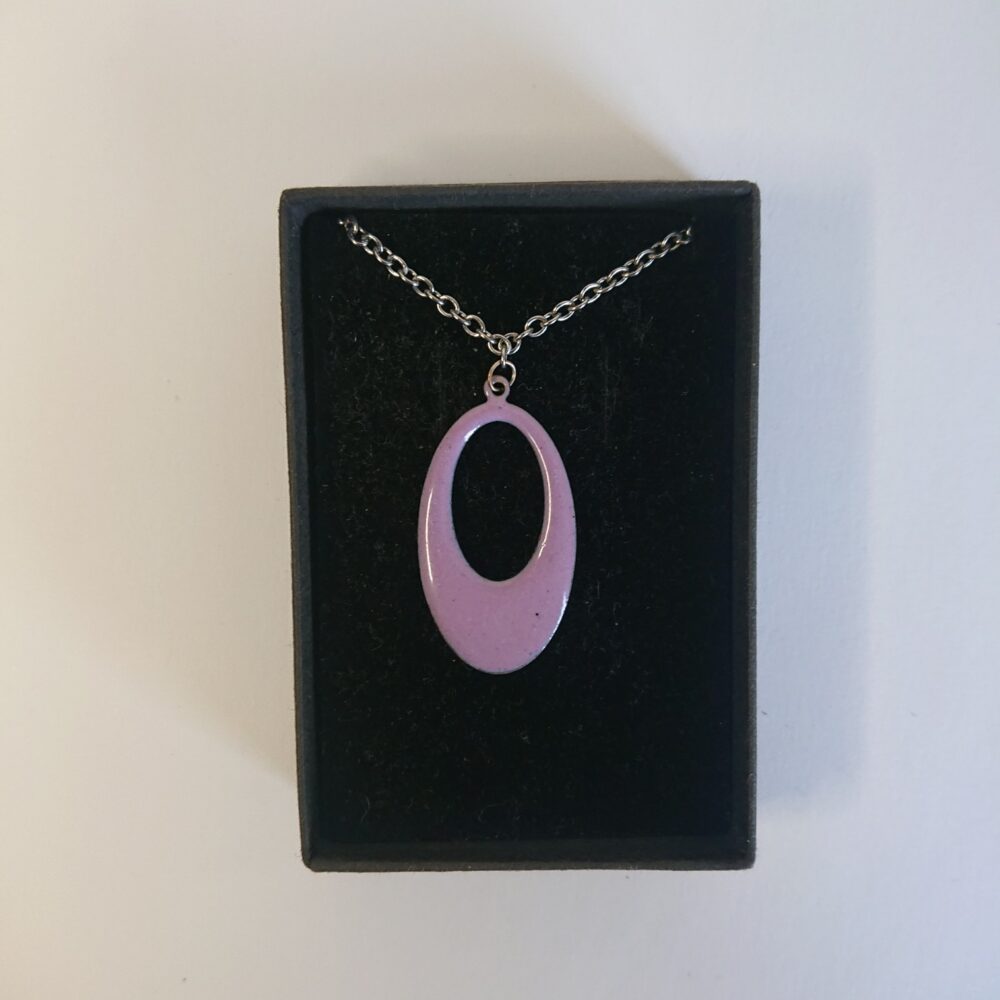 Oval pink enamelled necklace on silver colour, surgical steel, allergy-safe chain, presented in a black box. The oval has an oval hole in it. I made the necklace using pink opaque vitreous enamel. For the last firing I left the necklace pendant for longer in the kiln. This gave lighter and darker dots, which make it more interesting.