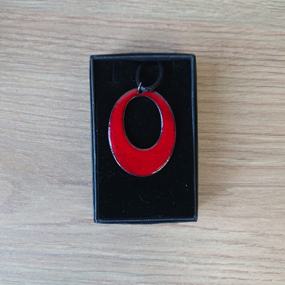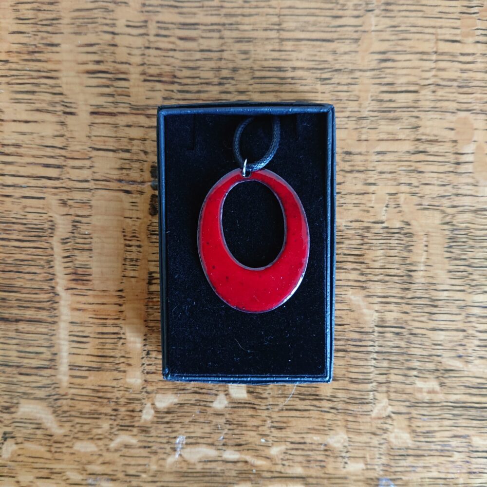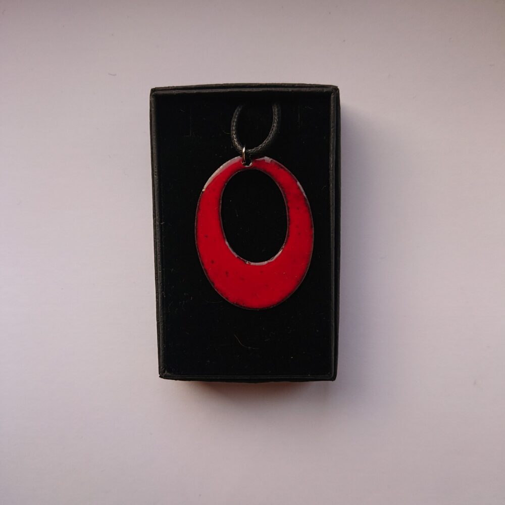 Oval red enamelled necklace with a black waxed cotton cord, presented in a black box. Red enamel easily ‘burns’ in the kiln. This gives it s dark outer edge and dark dots. This pendant has a little burning, more on the back. I like the effect though, makes it more interesting I think. The back of the necklace has been enamelled in red because the enamel on the back stops it warping too much in the kiln. The pendant is 4 by 3.5cm approx.