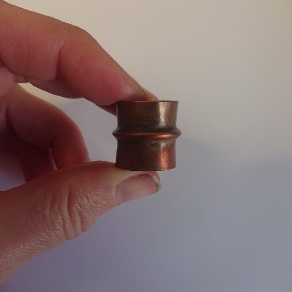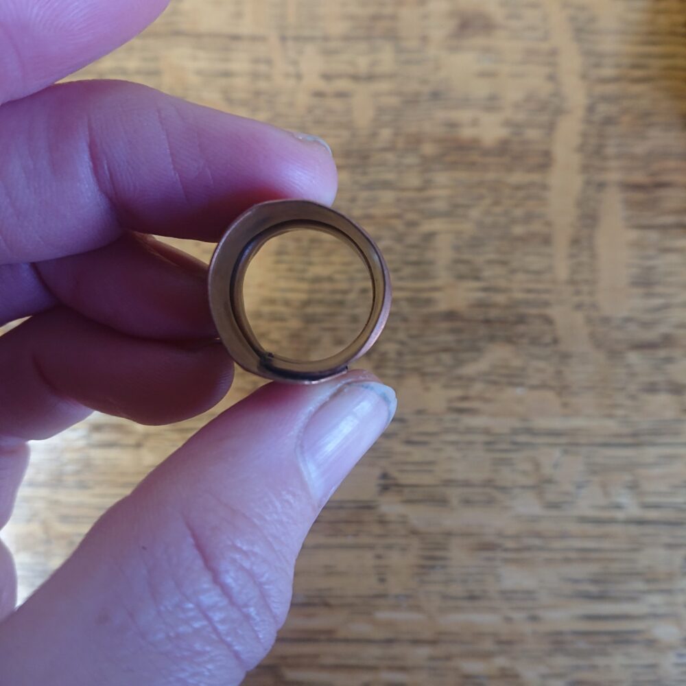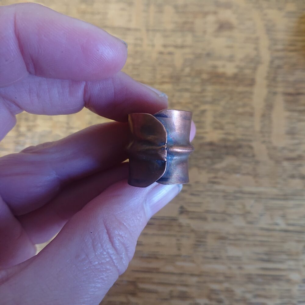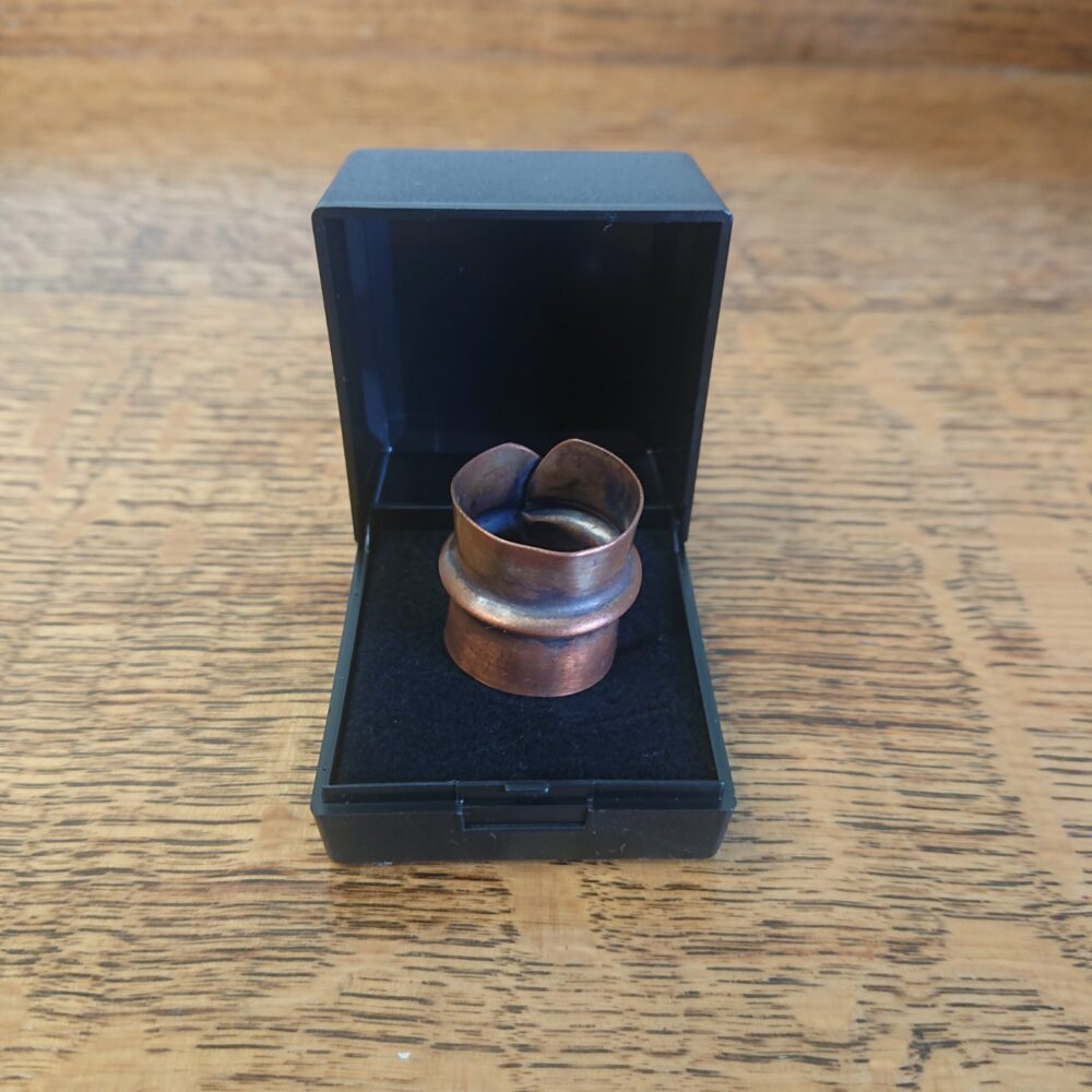 Chunky copper ring with fold line around the middle and overlapping design. I make these rings from sheet copper – cut, fold, shape then given an aged copper colour. The colour varies each time I make this ring, but is like an aged copper pipe. When I made these, they ended up a bit taller or longer than usual. They’re about 2 to 2.2cm tall/long/deep. The height of the ring is about 1.5cm to 1.8cm. It comes in a black presentation box.