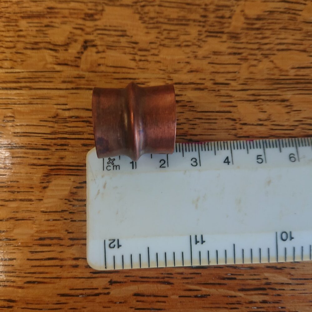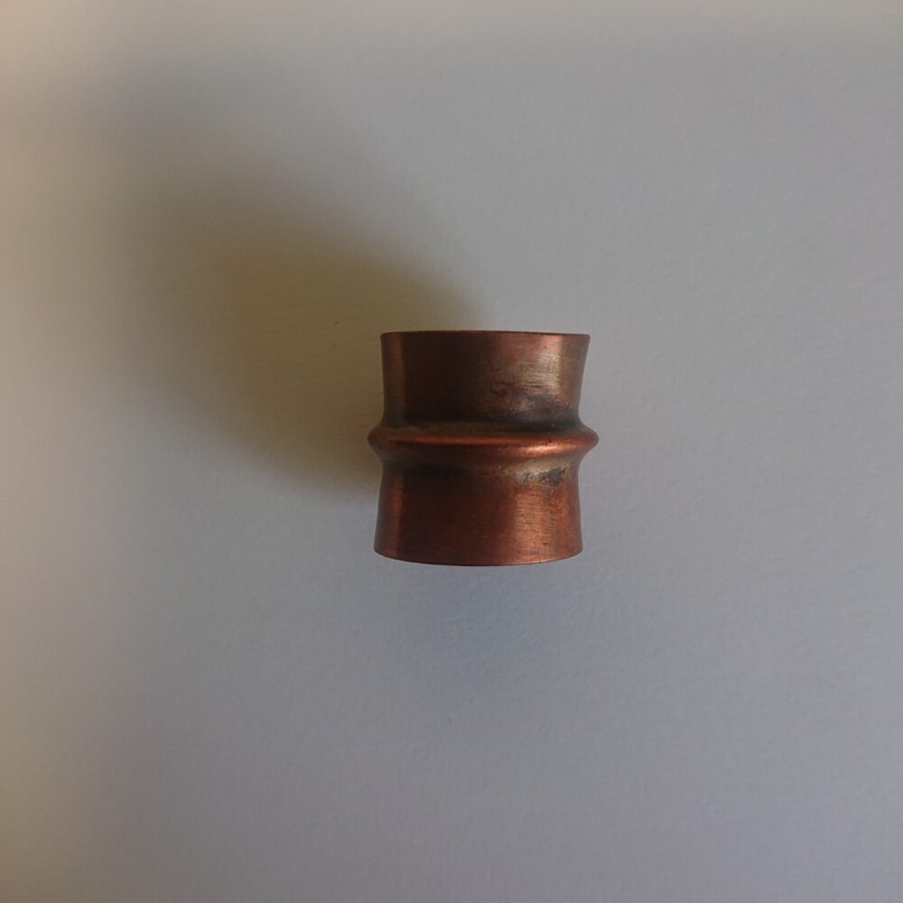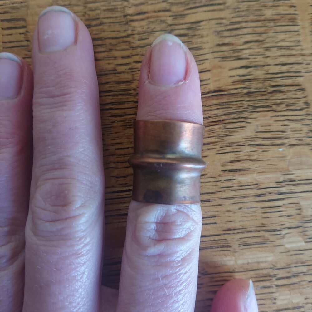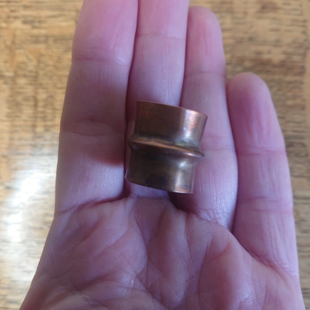 Chunky copper ring with fold line around the middle and overlapping design. I make these rings from sheet copper – cut, fold, shape then given an aged copper colour. The colour varies each time I make this ring, but is like an aged copper pipe. When I made these, they ended up a bit taller or longer than usual. They’re about 2 to 2.2cm tall/long/deep. The height of the ring is about 1.5cm to 1.8cm. It comes in a black presentation box.