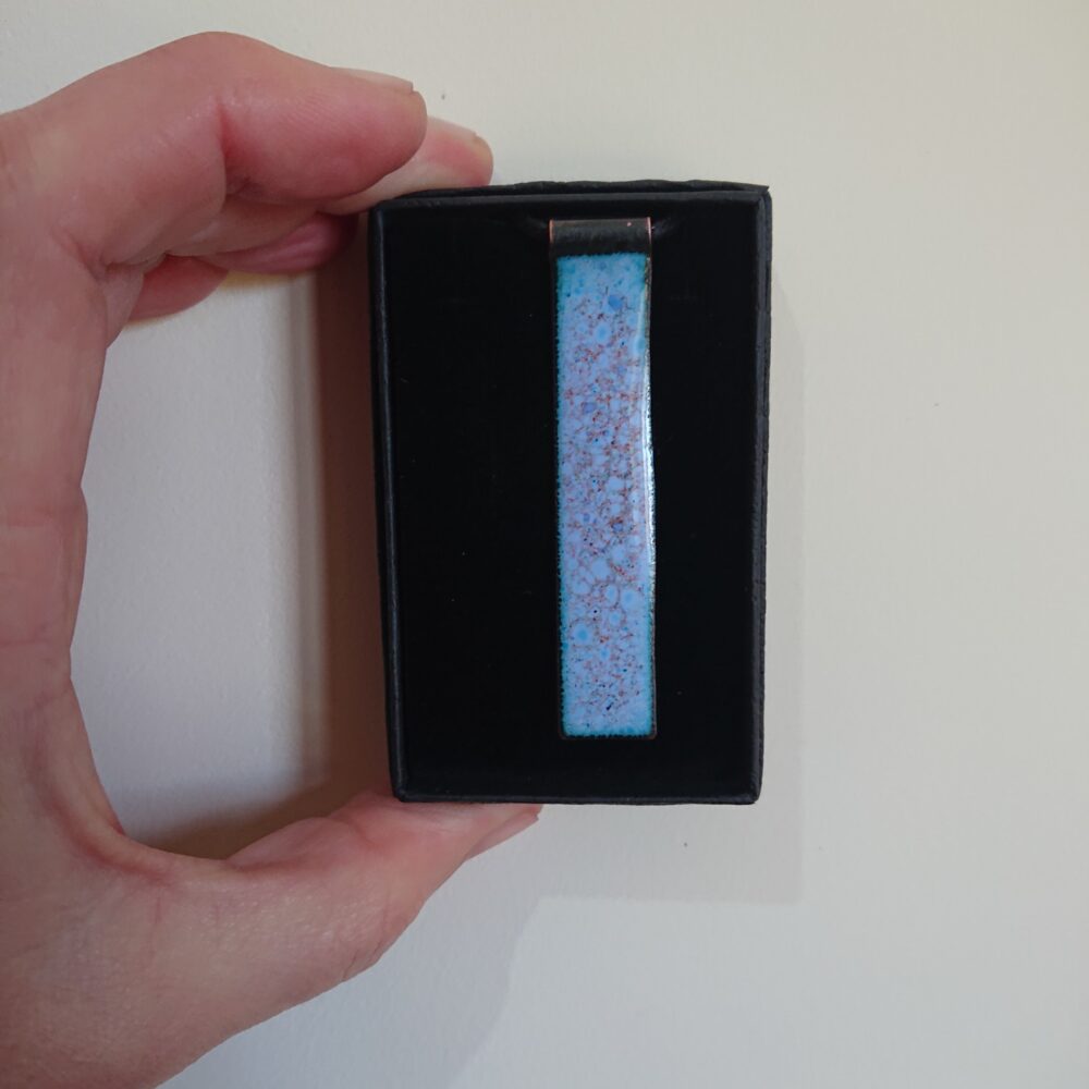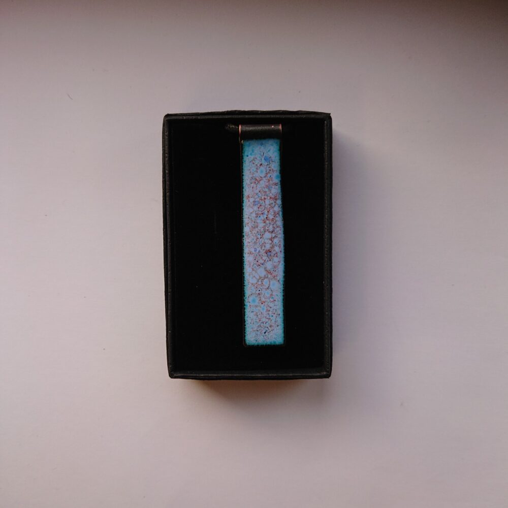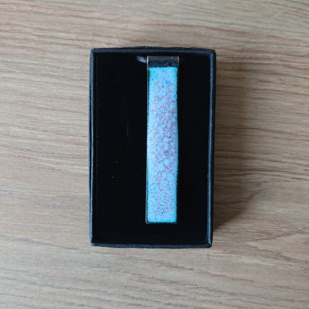 Pale blue rectangle enamelled copper necklace with colourful dots. To make this necklace, I cut a strip of copper and curled around one end. My aim was to have a different way to attach the cord to the pendant. I enamelled the rectangle in pale blue enamel. On the last firing I added a mixture of enamels. This has given dots and blobs of other colours. I think the dominant other colour is probably orange. The back of the necklace has been enamelled in pale blue because the enamel on the back stops it warping too much in the kiln. The back does show marks/lumps from how the pendant was held in the kiln.