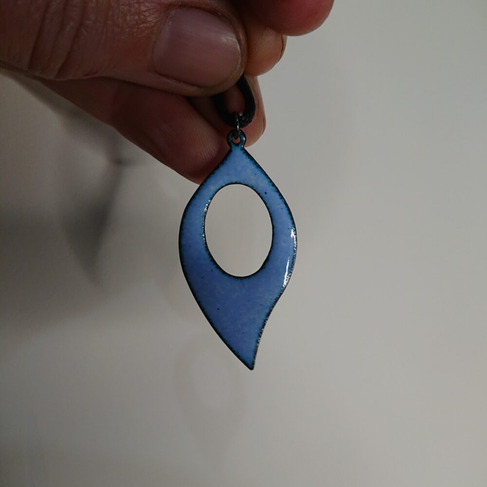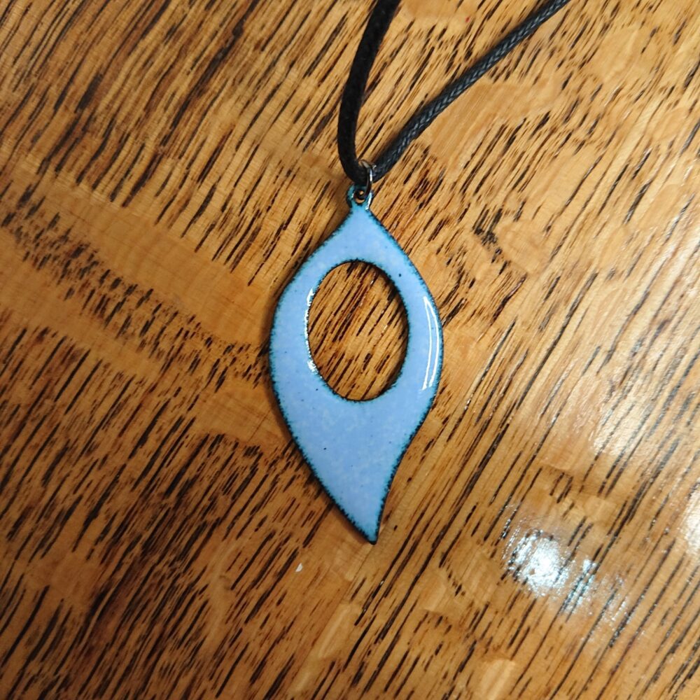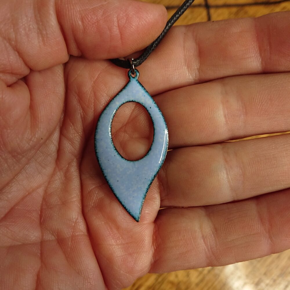 Pale blue enamelled necklace in a stylised leaf shape or drop shape with a hole in the centre. I made the necklace using pale blue vitreous enamel. For the last firing I added sprinkles of white and gave it a bit longer in the kiln (overfiring). This gave small white or paler blue dots, plus a darker outer edge and a few darker dots. The effect is quite subtle.