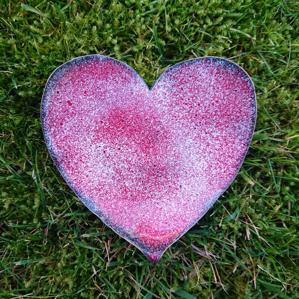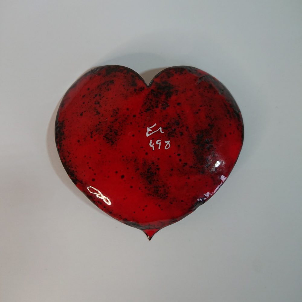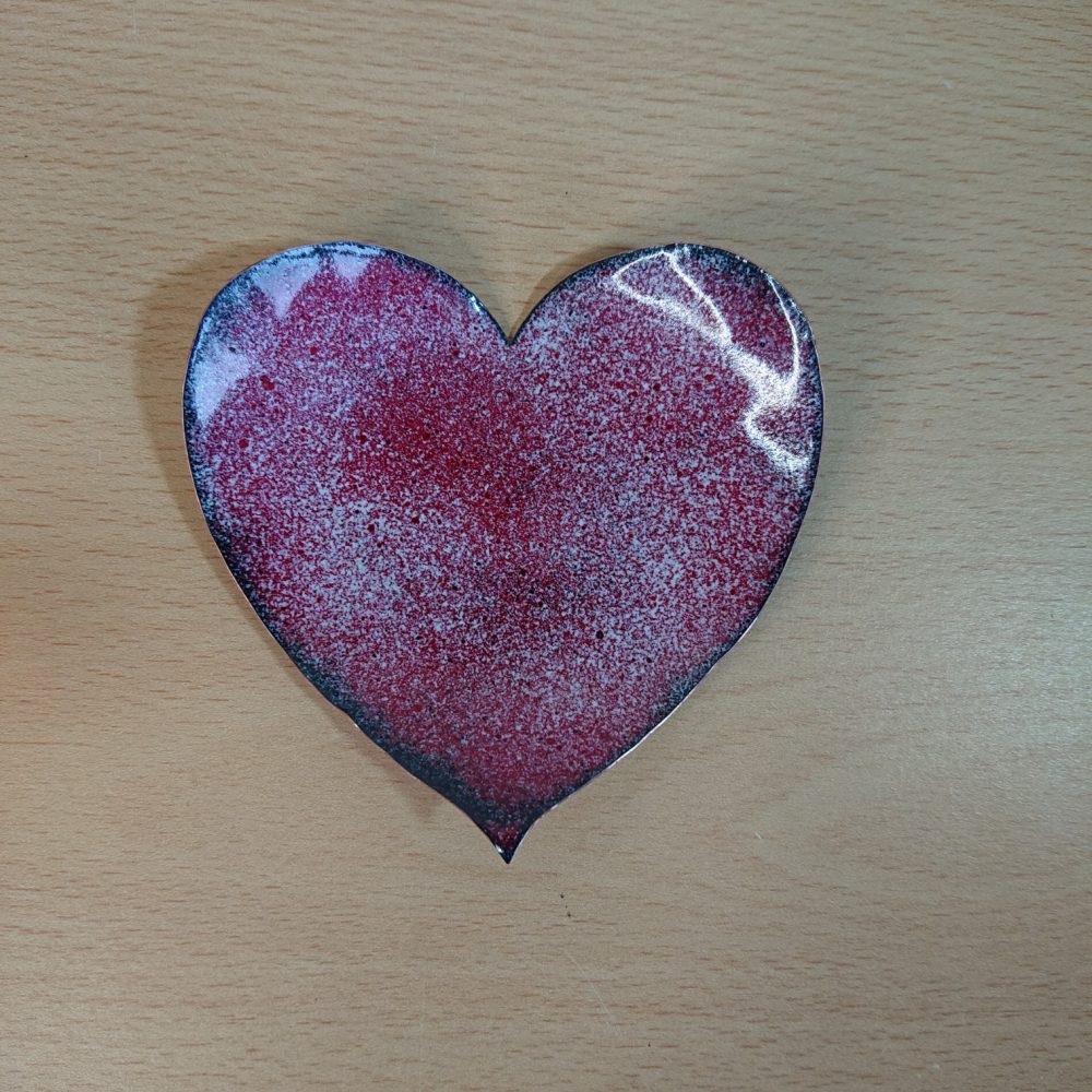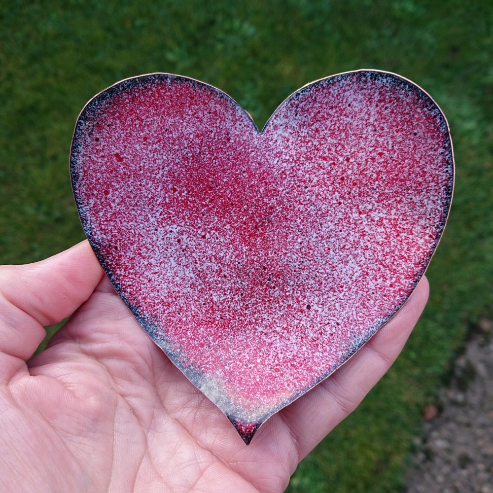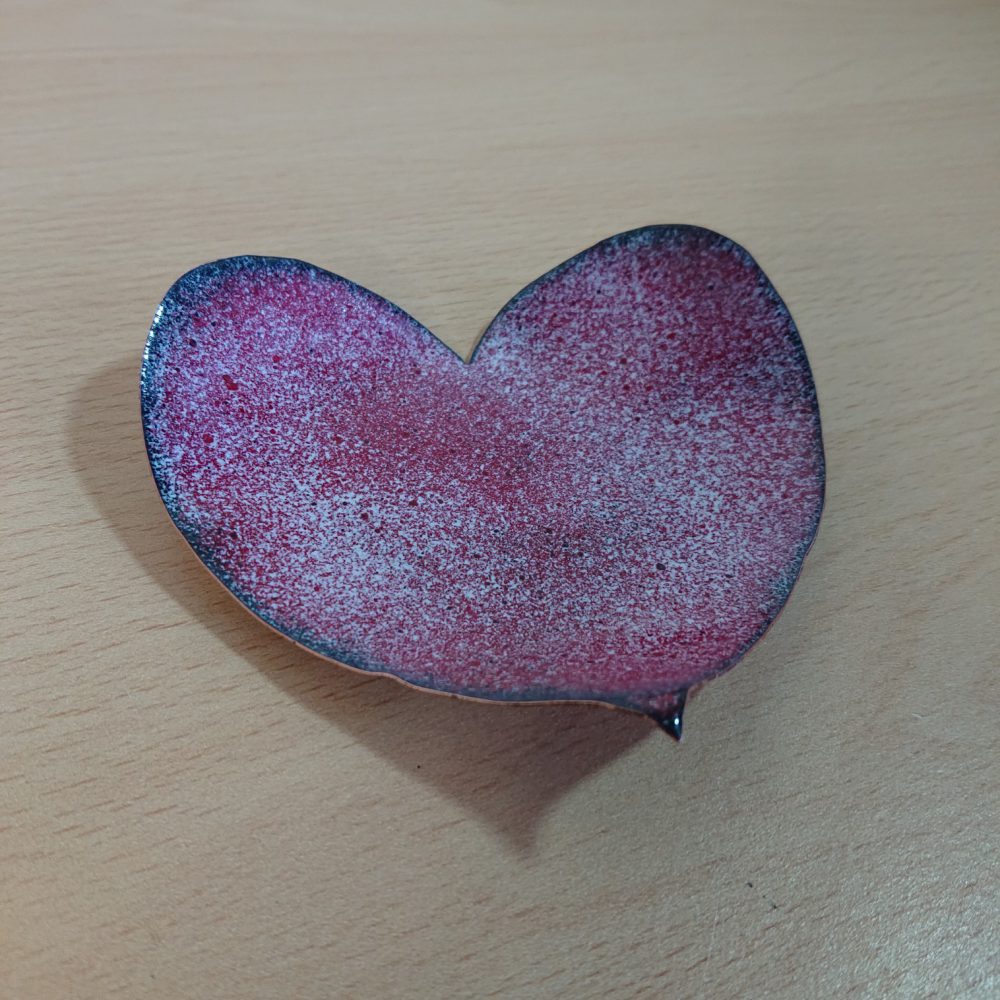 I made this bowl starting with 0.5mm thick copper sheet. I cut a heart shape out using a jewellers saw and shaped it into a shallow bowl. Once I’d got the shape, I enamelled it using vitreous enamel and a kiln. The main enamel colour is red, but on the last firing I added a sprinkle of white enamel. This gave the red heart shaped bowl lots of tiny white spots. The back of the bowl is enamelled in red and signed. Enamel is effectively a glass coating. It can crack if the bowl is dropped, but is reasonably tough. I don’t think I’d trust it in a dishwasher though.