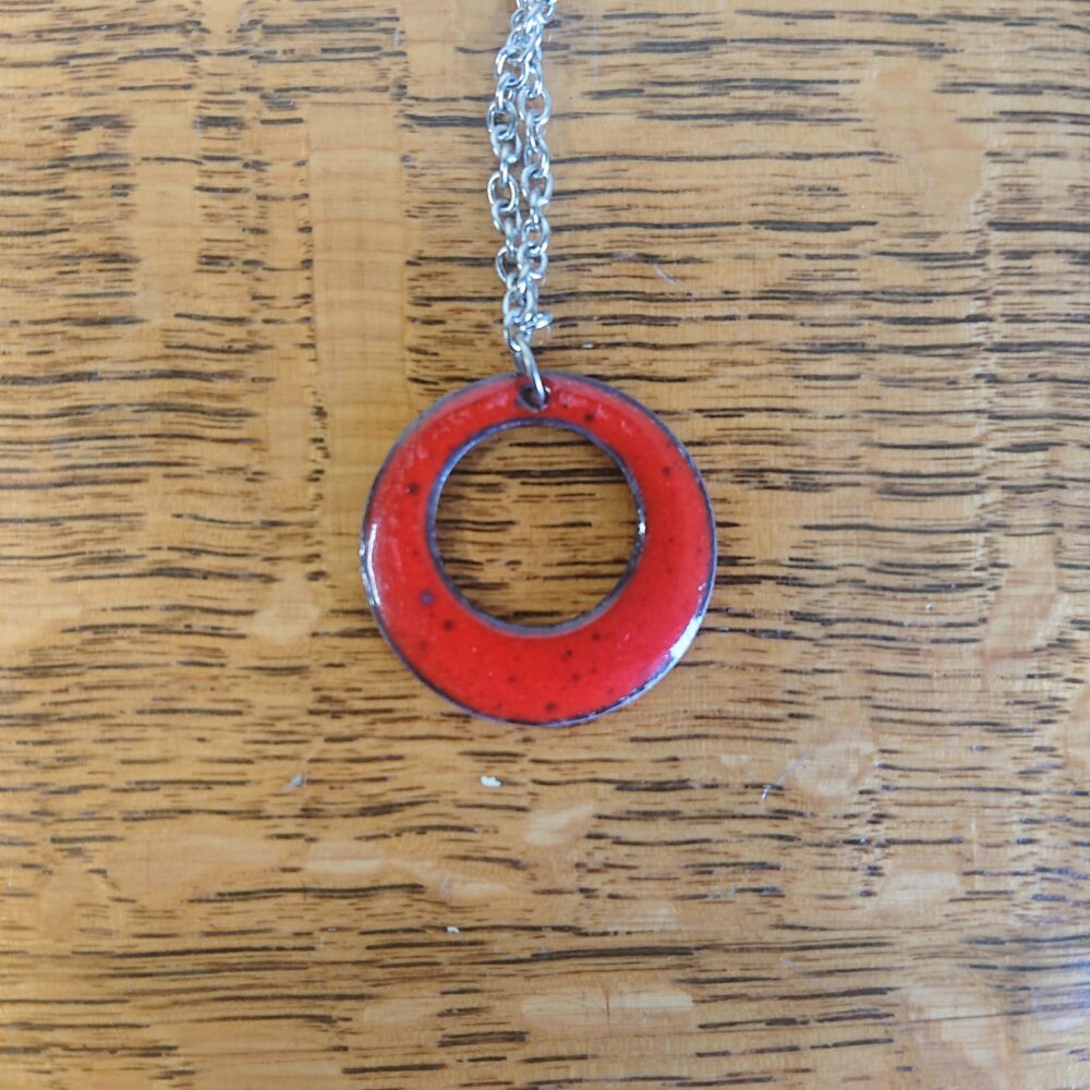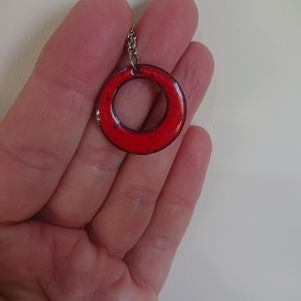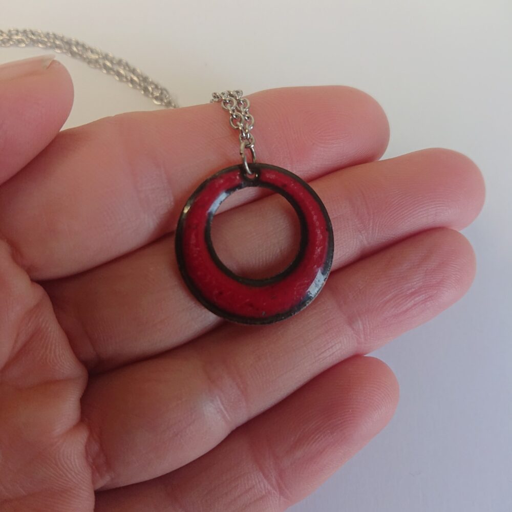 Red round enamelled necklace on a surgical steel, allergy-safe chain, presented in a black box. The pendant was given slightly longer in the kiln to cause it to form black dots and a black outer edge. The chain is slightly longer than often, at 60cm total length, because it can always be made shorter with a knot. Surgical steel looks silver, but doesn’t tarnish. The back of the necklace has been enamelled in red because the enamel on the back stops it warping too much in the kiln. One photo shows the back. The pendant stuck a little to its stand in the kiln so the surface has very fine marks.