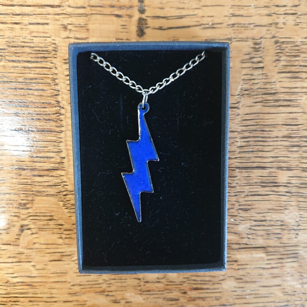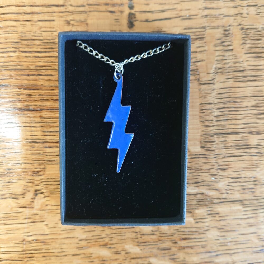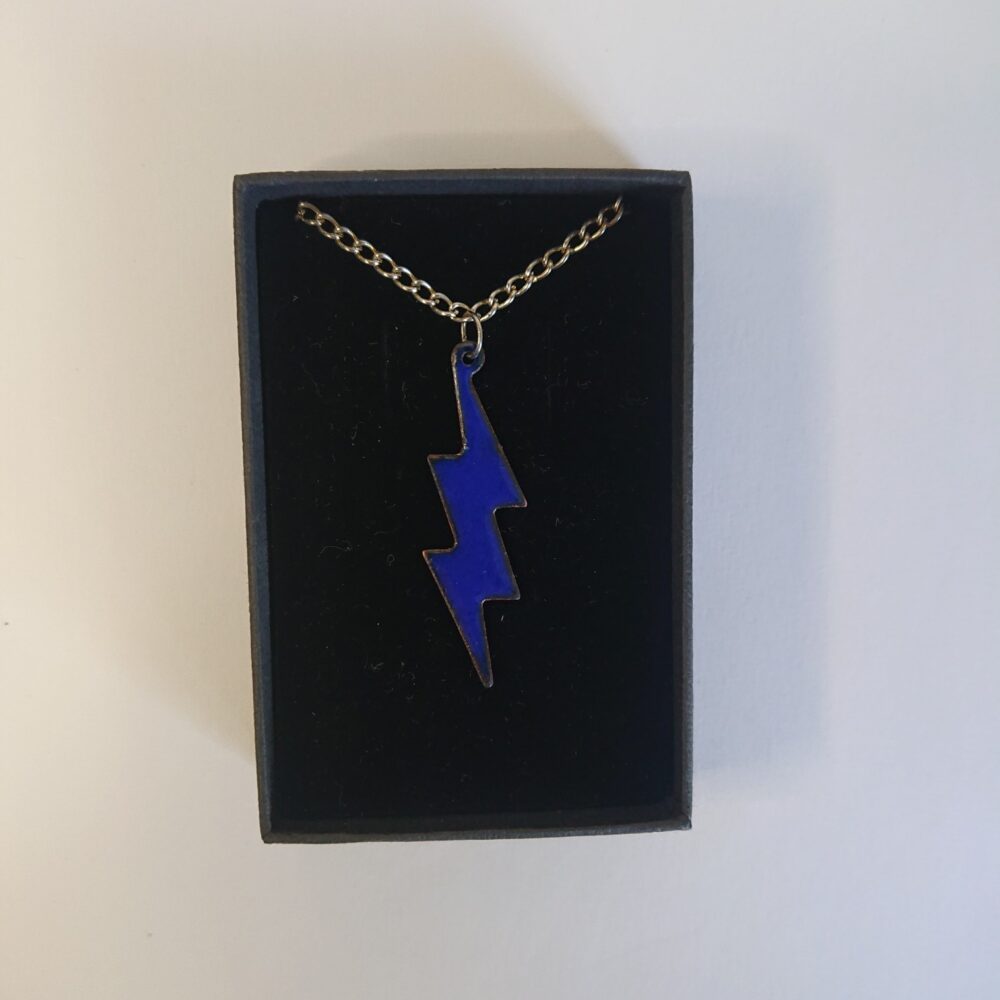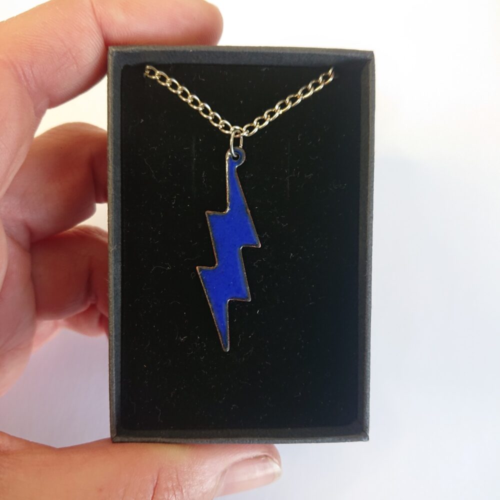 Royal blue enamelled lightning bolt shaped necklace pendant on a surgical steel chain. Surgical steel looks silver, but doesn’t tarnish. It comes in a black presentation box. The chain is slightly longer than often, because it can always be made shorter with a knot. The back of the necklace has been enamelled in blue too because the enamel on the back stops it warping too much in the kiln. One photo shows the back. The pendant is just over 4cm long.
