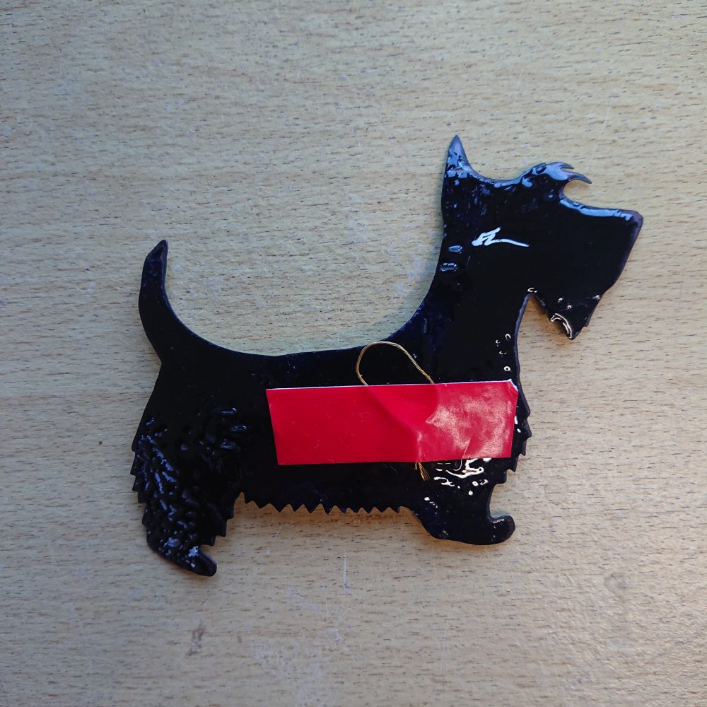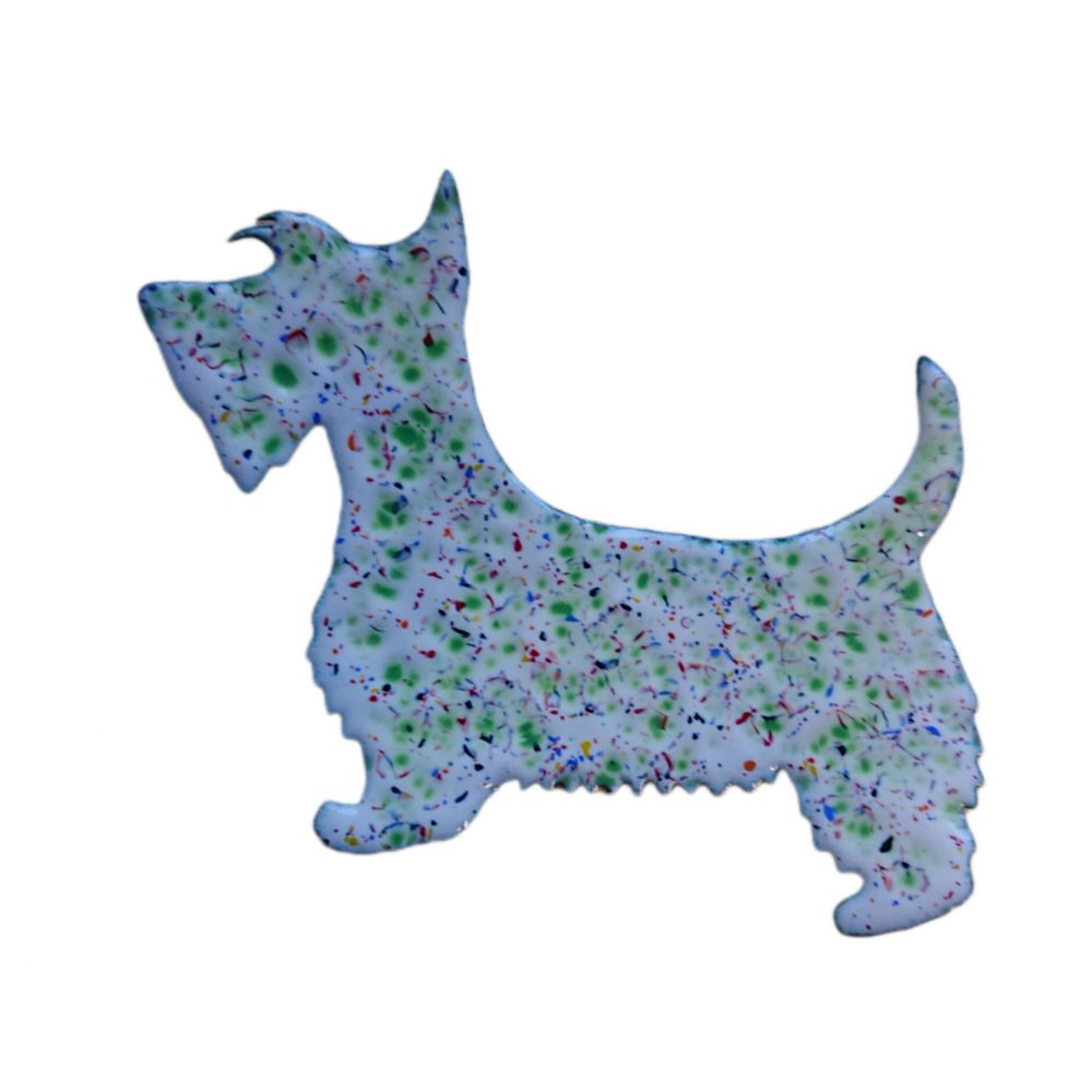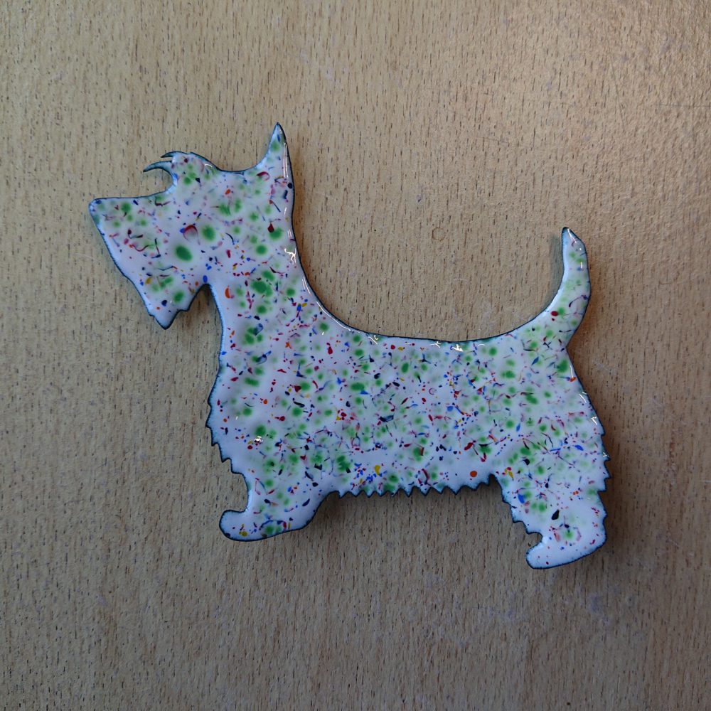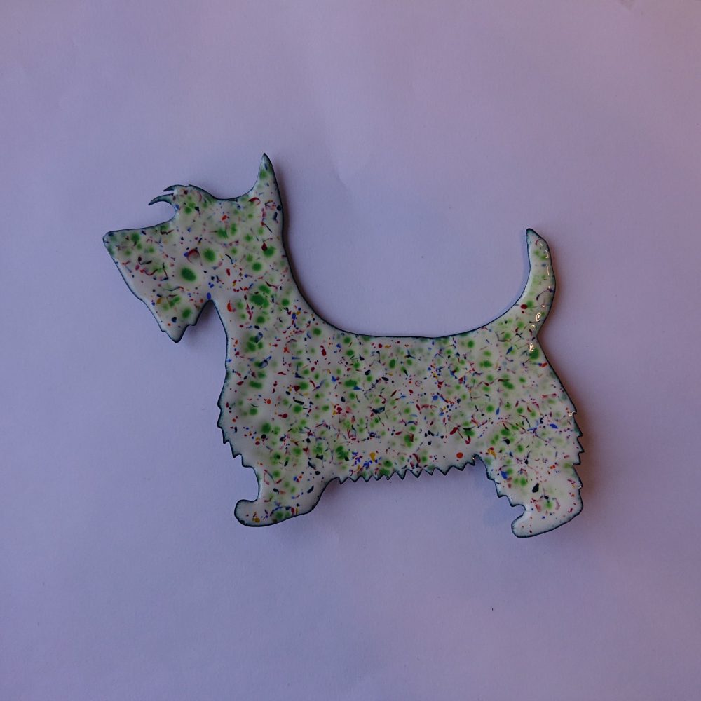 Enamelled scottie dog wall hanging. I started by cutting a scottie dog shape out of sheet copper. After that I enamelled it using vitreous enamel. The first layers of enamel were called ivory (slightly creamy white). To make the dog more interesting, I then did a crushed glass firing. This has given mostly green dots, but other colours too. I think of it as more of a scottie dog shape, but it doesn’t have to be.