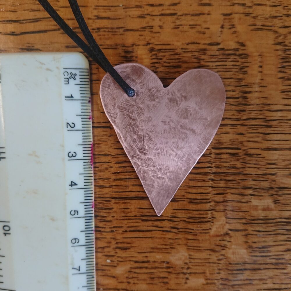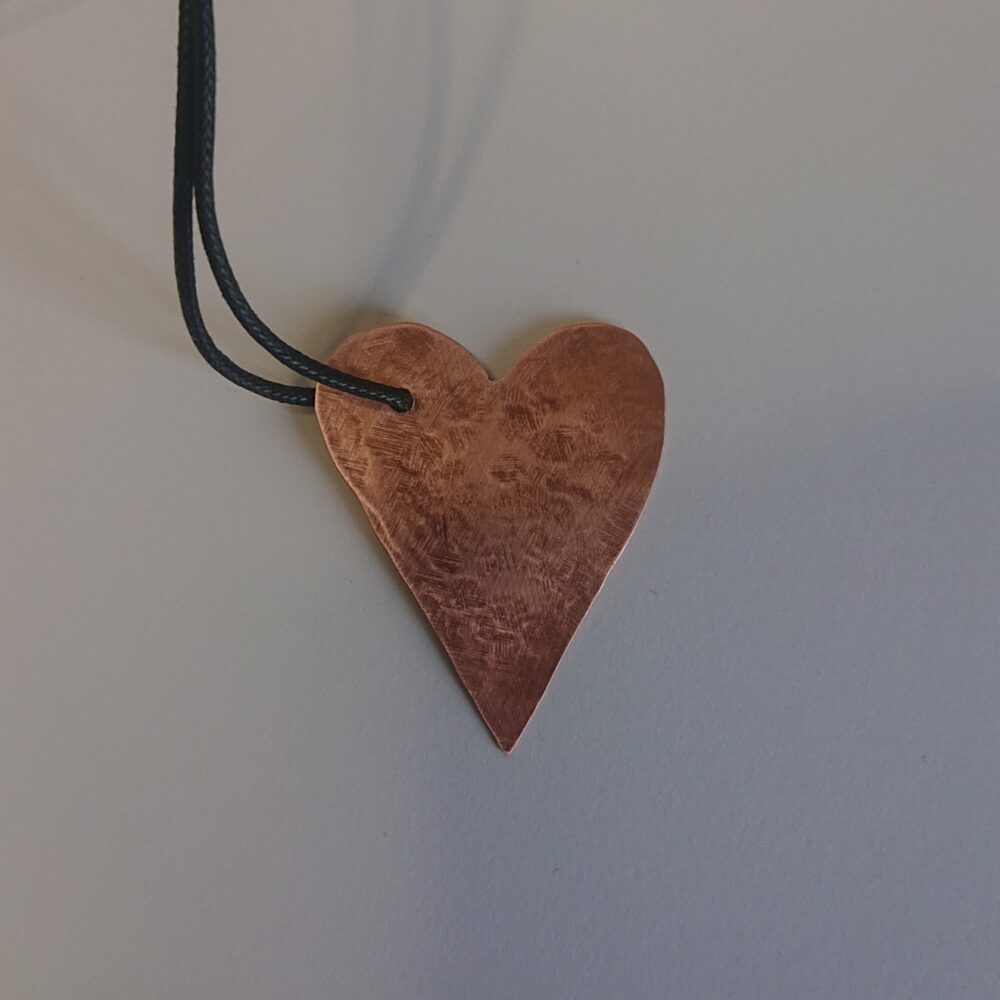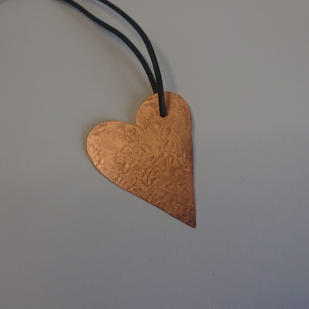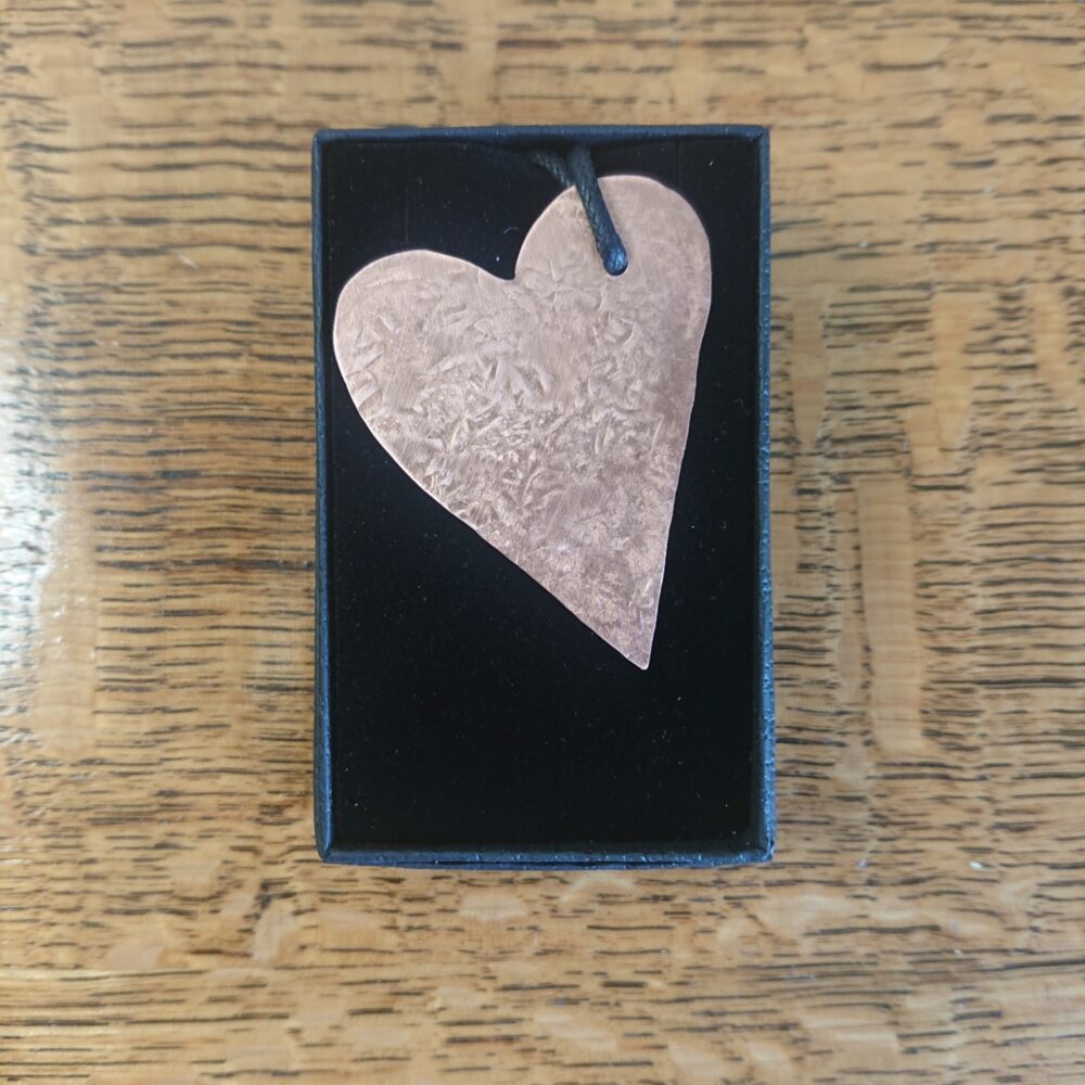 Textured copper heart necklace cut from sheet copper, hanging from black waxed cord. I made this pendant by cutting a heart shape out of sheet copper. To add interest I hammered the heart against a metal block. This gives a slightly scuffed pattern on one side and a slightly more obvious hammer mark pattern on the other. This means you can wear it whichever way you prefer. I polished it then coated it in lacquer to keep it shiny. The lacquer may rub off though with time and wear. It’s on a black waxed cotton cord. The hole for the cord is off-centre so the heart hangs at an angle. The cord has a T-bar type clasp, handmade from copper. For the clasp, the curly end slots into the round end. The copper for the clasp is not lacquered. If you want the necklace shorter, you can fasten it with a knot instead. The necklace comes in a black presentation box.