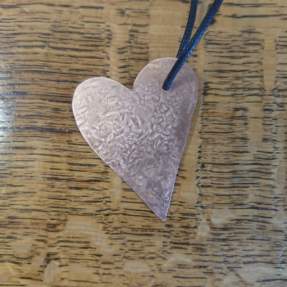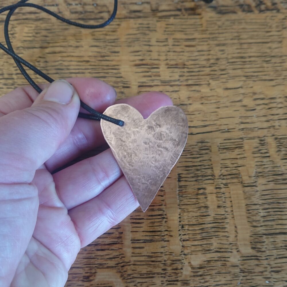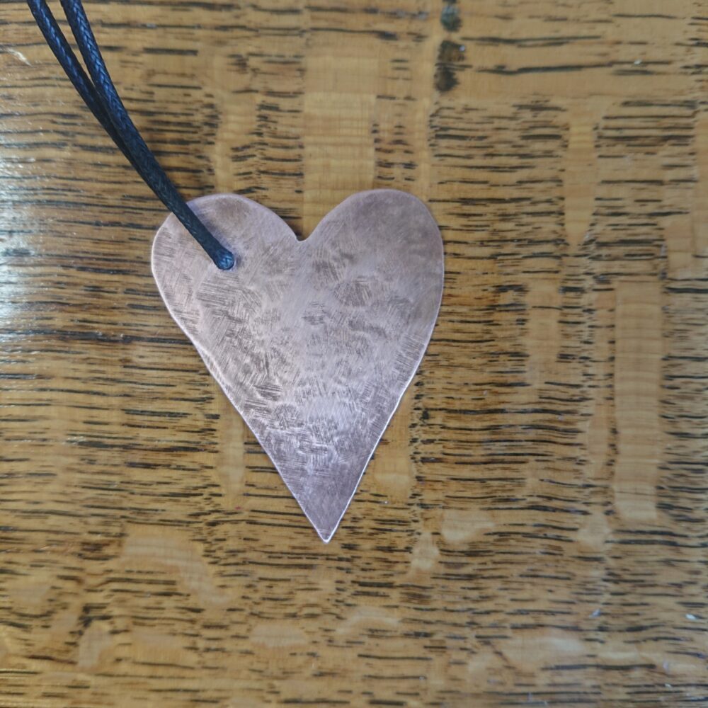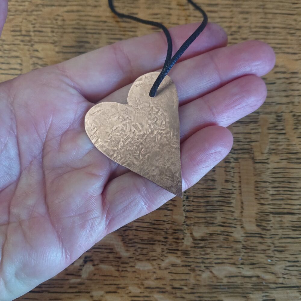 Textured copper heart necklace cut from sheet copper, hanging from black waxed cord. I made this pendant by cutting a heart shape out of sheet copper. To add interest I hammered the heart against a metal block. This gives a slightly scuffed pattern on one side and a slightly more obvious hammer mark pattern on the other. This means you can wear it whichever way you prefer. I polished it then coated it in lacquer to keep it shiny. The lacquer may rub off though with time and wear. It’s on a black waxed cotton cord. The hole for the cord is off-centre so the heart hangs at an angle. The cord has a T-bar type clasp, handmade from copper. For the clasp, the curly end slots into the round end. The copper for the clasp is not lacquered. If you want the necklace shorter, you can fasten it with a knot instead. The necklace comes in a black presentation box.