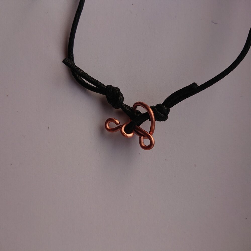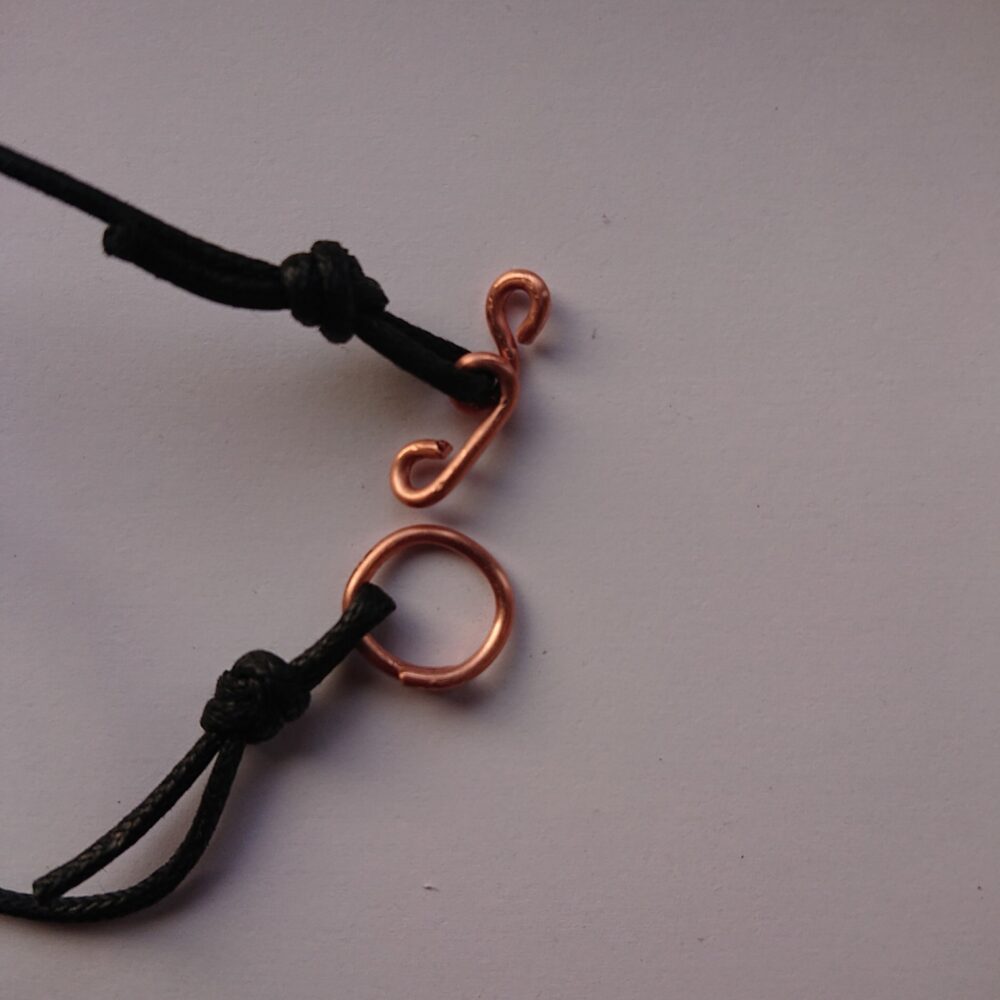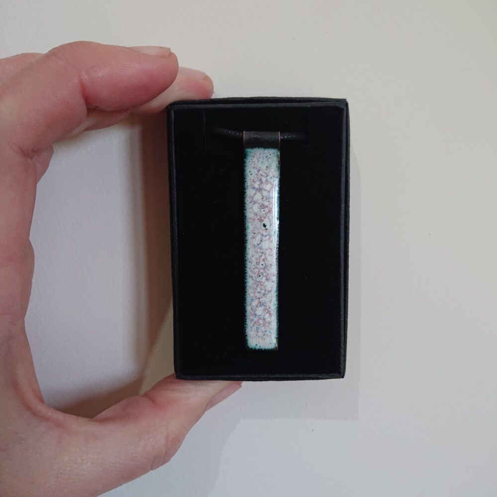 White rectangle enamelled copper necklace with colourful dots. To make this necklace, I cut a strip of copper and curled around one end. My aim was to have a different way to attach the cord to the pendant. I enamelled the rectangle in ivory enamel (creamy white enamel). I like ivory – it’s a warm white, but also gives great effects with other enamels. On the last firing I added a mixture of enamels. This has given dots and blobs of other colours. I think the dominant other colour is a bit pink/purple. The back of the necklace has been enamelled in ivory because the enamel on the back stops it warping too much in the kiln. The pendant is about 6cm by 1cm. It has a black waxed cotton cord with handmade copper t-bar type fixing. The cord is quite long because it can always be made shorter with a knot or scissors. The long bit of the fixing slides through the round bit. The fixing is pure copper without lacquer so will go darker with time.