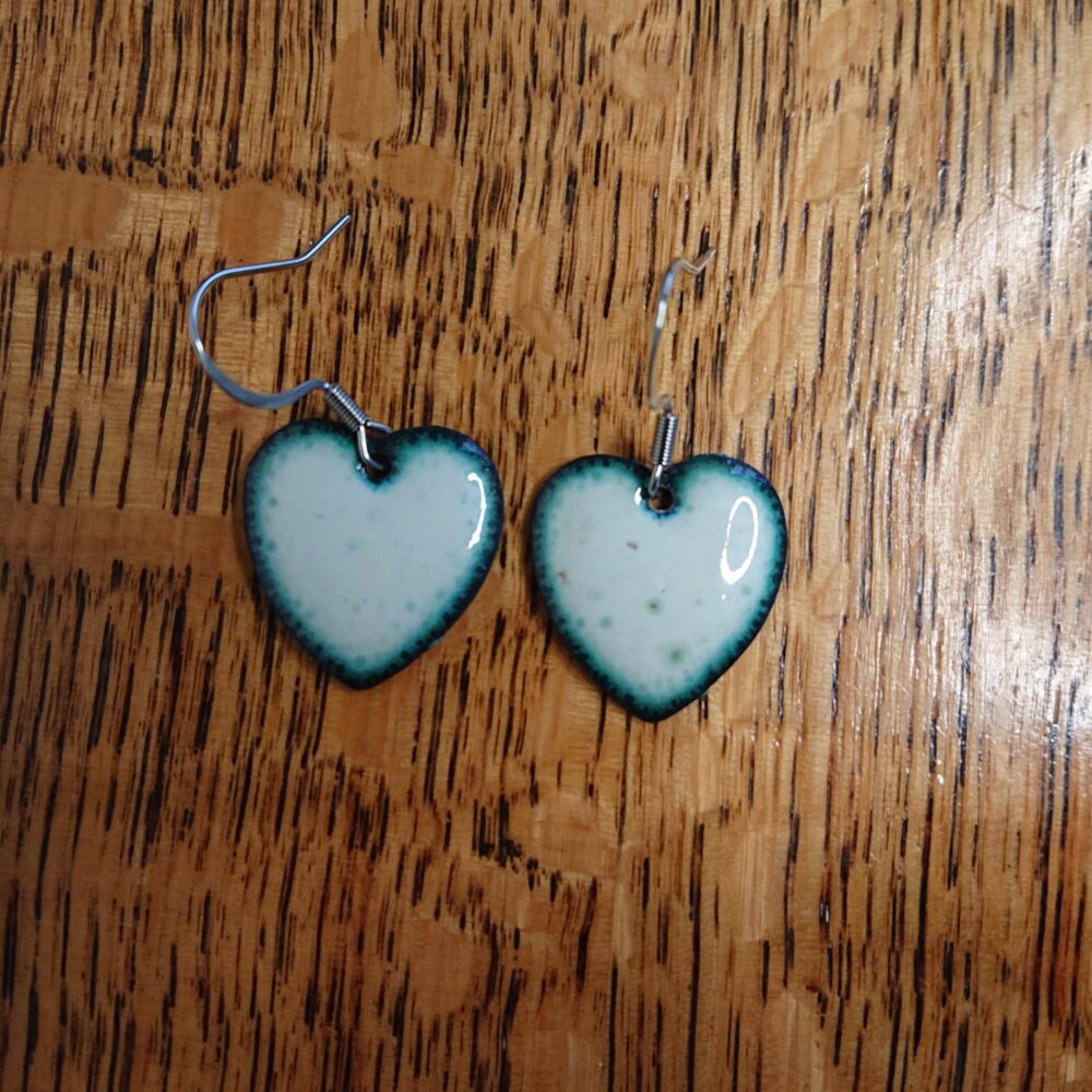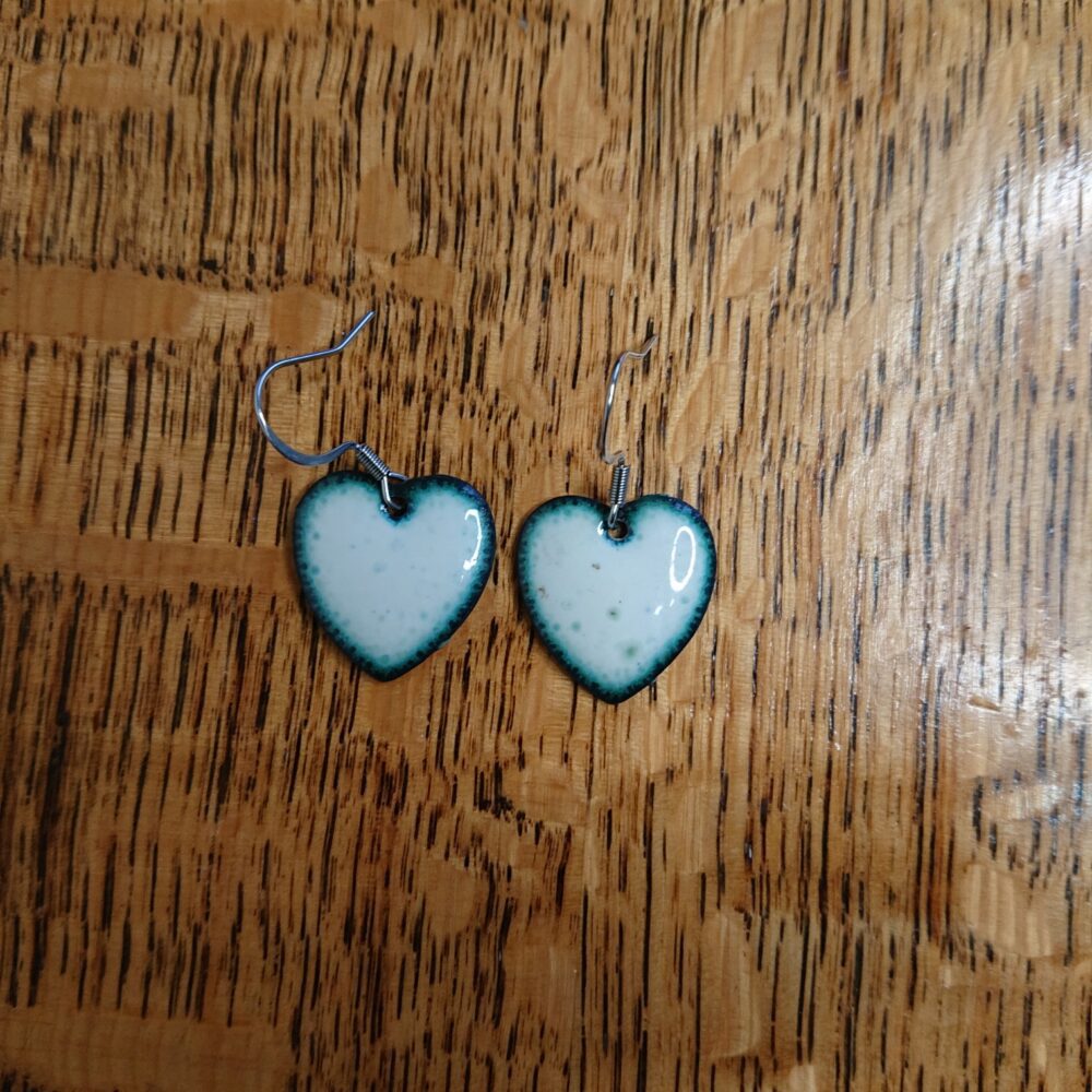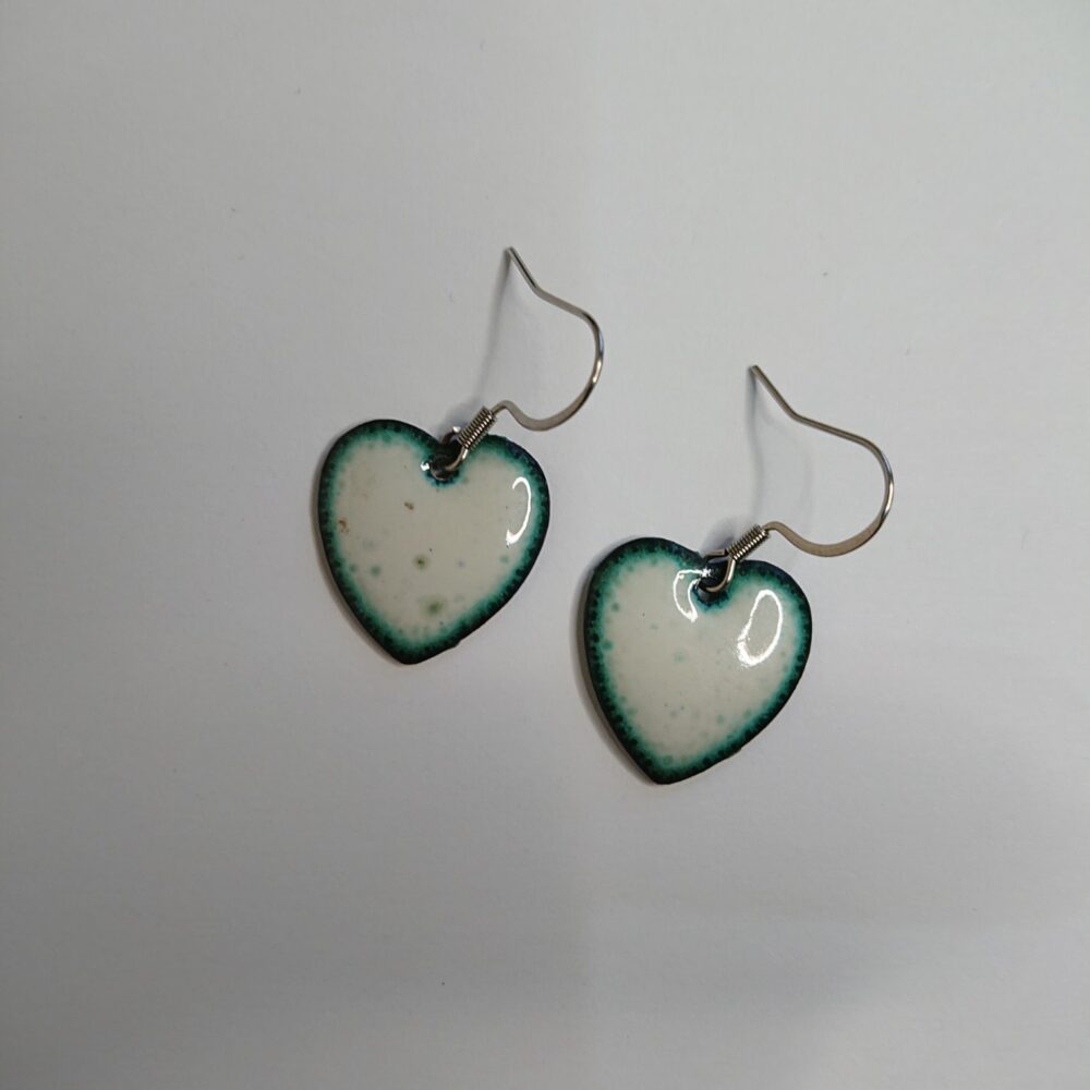 White heart shaped earrings on surgical steel, allergy-safe earhooks, presented in a black box. The white is a creamy white, not a sharp white (it’s called ivory on the pack). On the last firing I left the earrings in the kiln for longer, called overfiring. This has given the hearts a dark outer edge (with slightly green inner edge). There are also dark and slightly green dots in the white. Overfiring means they are not fully identical. The backs of the earrings have been enamelled in white as well because the enamel on the back stops them warping too much in the kiln. The hearts are just under 2cm long.